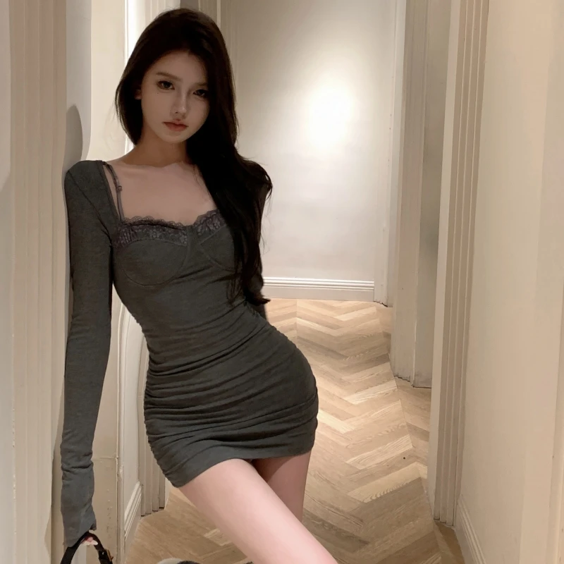 ZYHT 21541 Wholesale Crew Neck High Waist Casual Dresses Elegant Lace Velvet Mermaid Hem Ruched Long Sleeve Dresses for Women