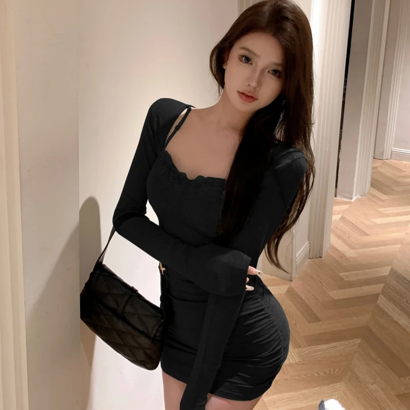 Women's Long-Sleeve Square-Neck Knit Dress - Tight-Fitting Mini Style, Casual Slimming Outfit for Daily & Dating