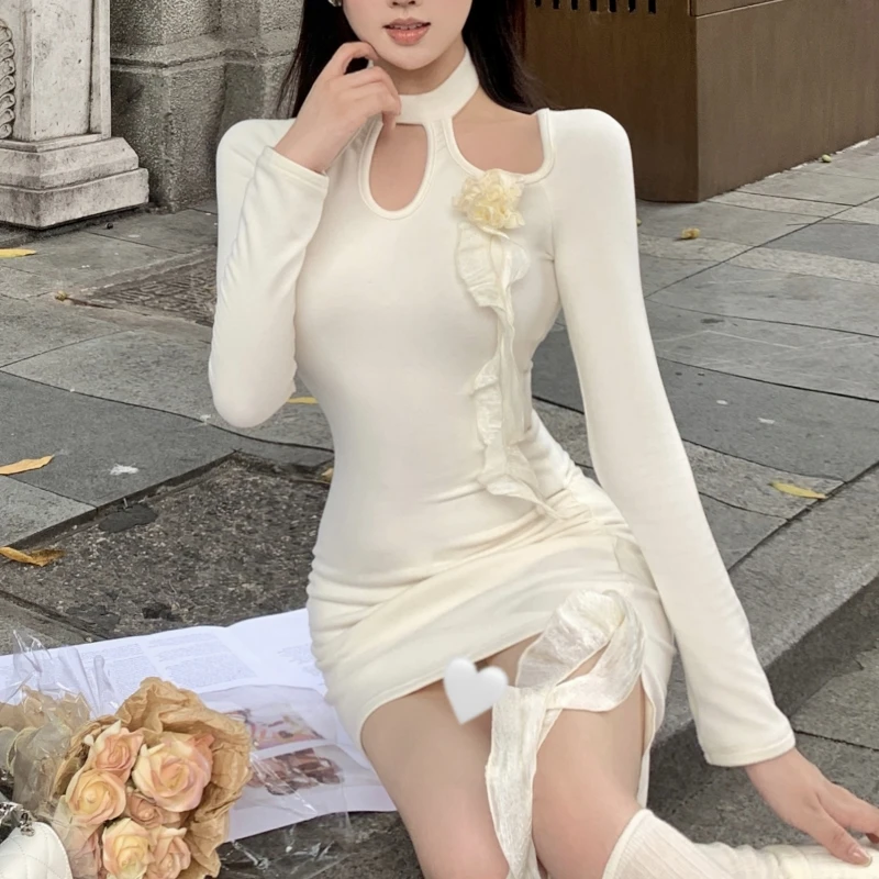 Women's Long-Sleeve Halter Neck Knit Dress - Tight-Fitting Mini Style, Casual Slimming Outfit for Spring & Autumn