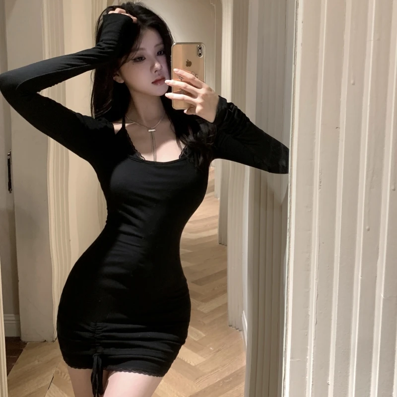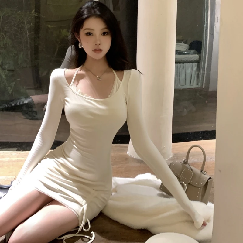 Women's Casual Long-Sleeve Halter Neck Knit Dress - Tight-Fitting Mini Style, Slimming for Spring & Autumn Daily/Dating Wear