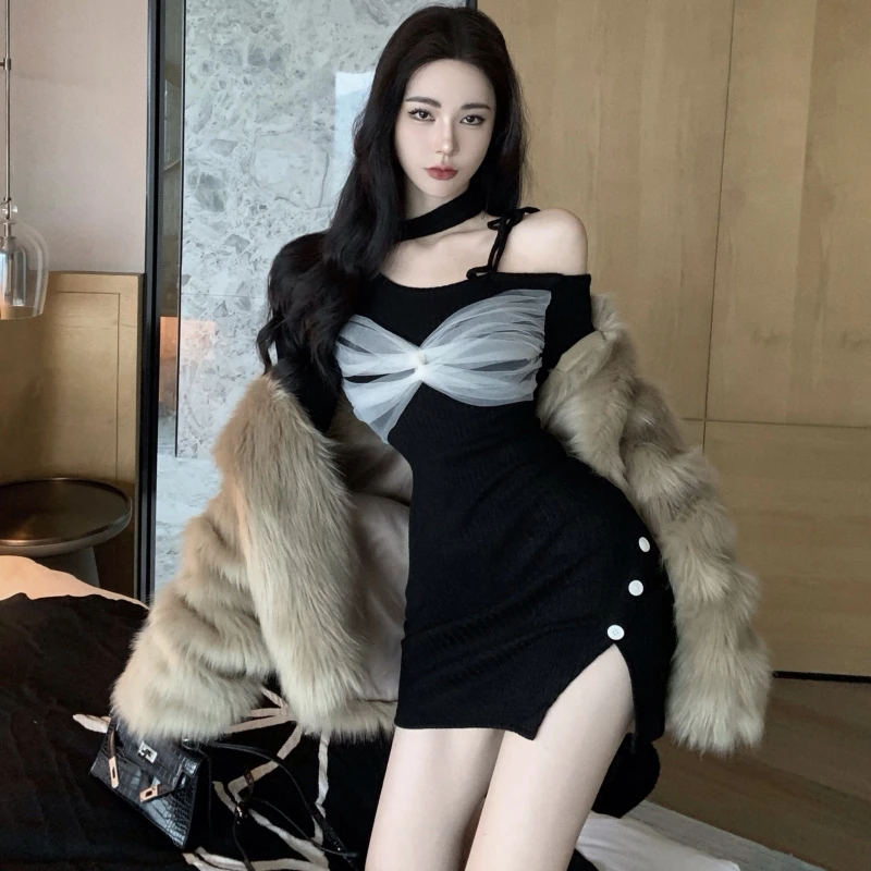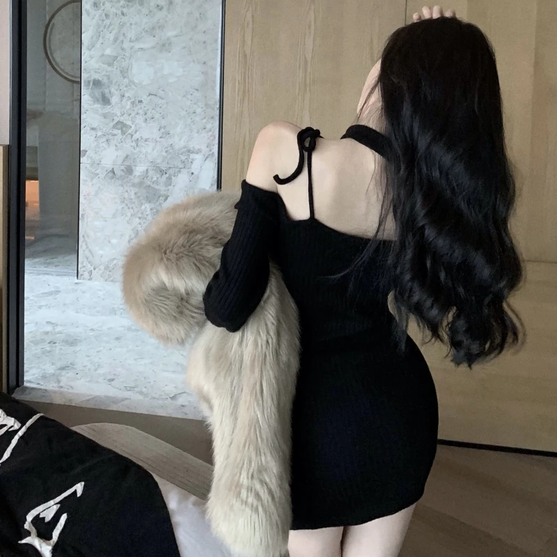 Women's Casual Long-Sleeve Asymmetrical Shoulder Knit Dress - Tight-Fitting Mini Style, Slimming for Spring Autumn Daily/Dating