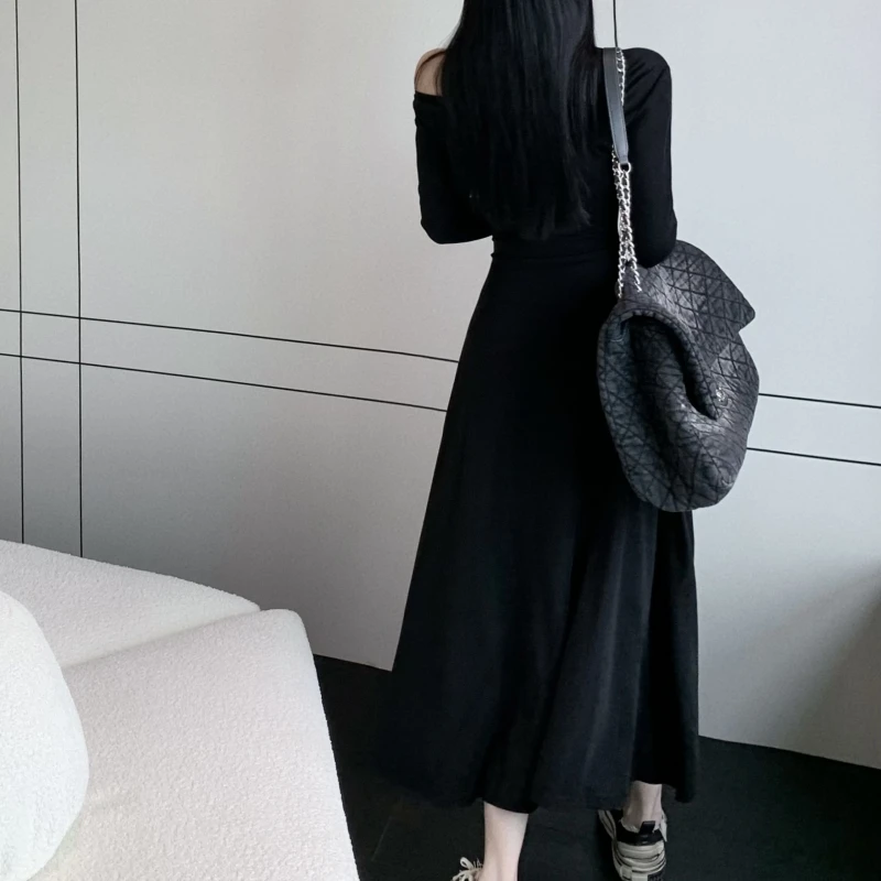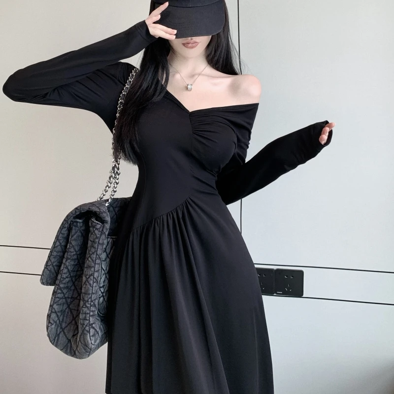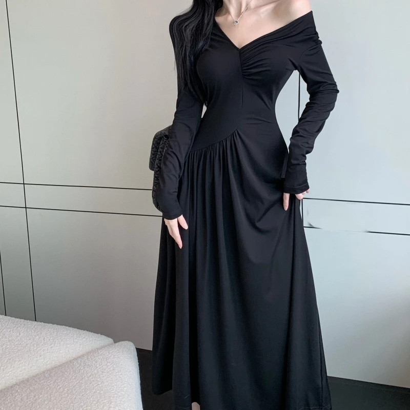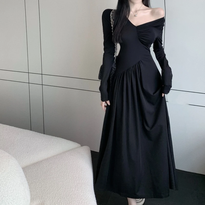 ZYHT 73849 European Wholesale Fashion Casual One Shoulder Ruched Maxi Dress Side Slit Pleated Long Sleeve Dresses for Women