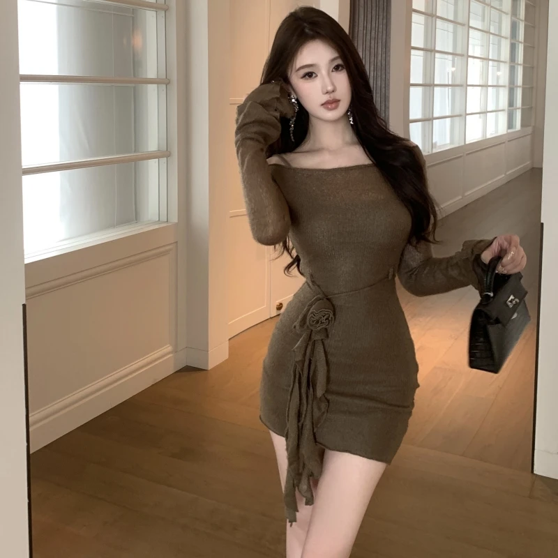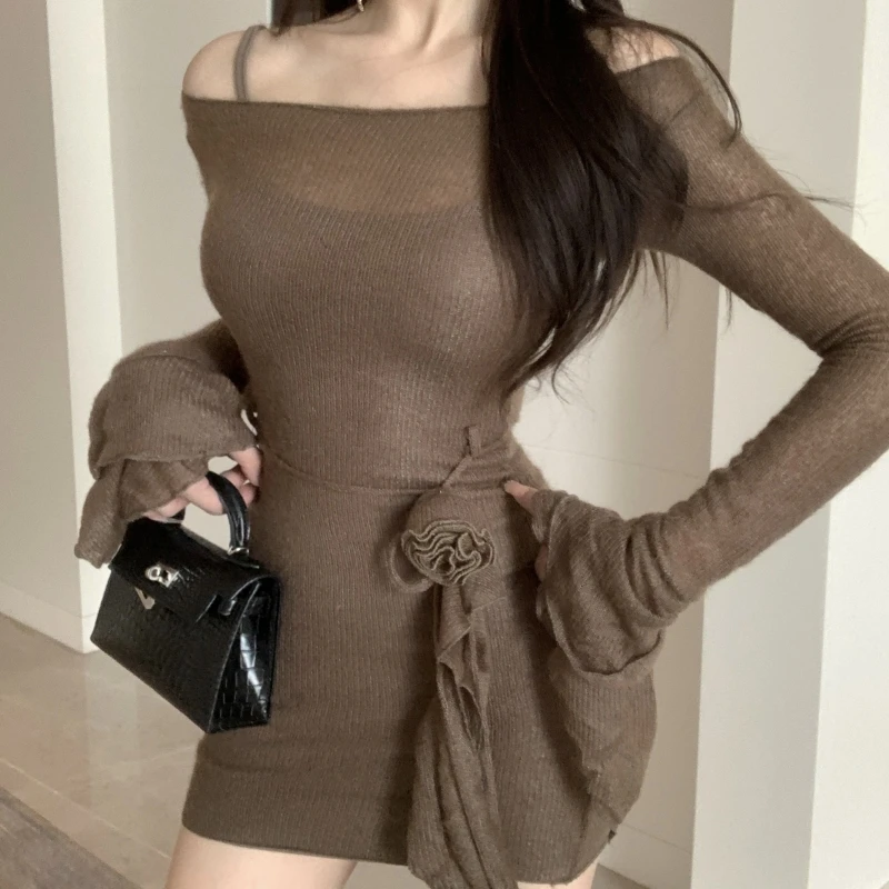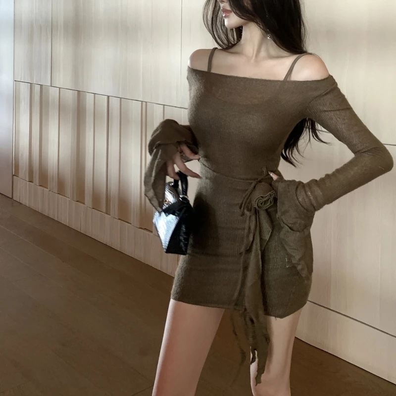 New Style Skirt Long Sleeves Waist Sexy Dress Knitted Slim Suspender Dress for Women