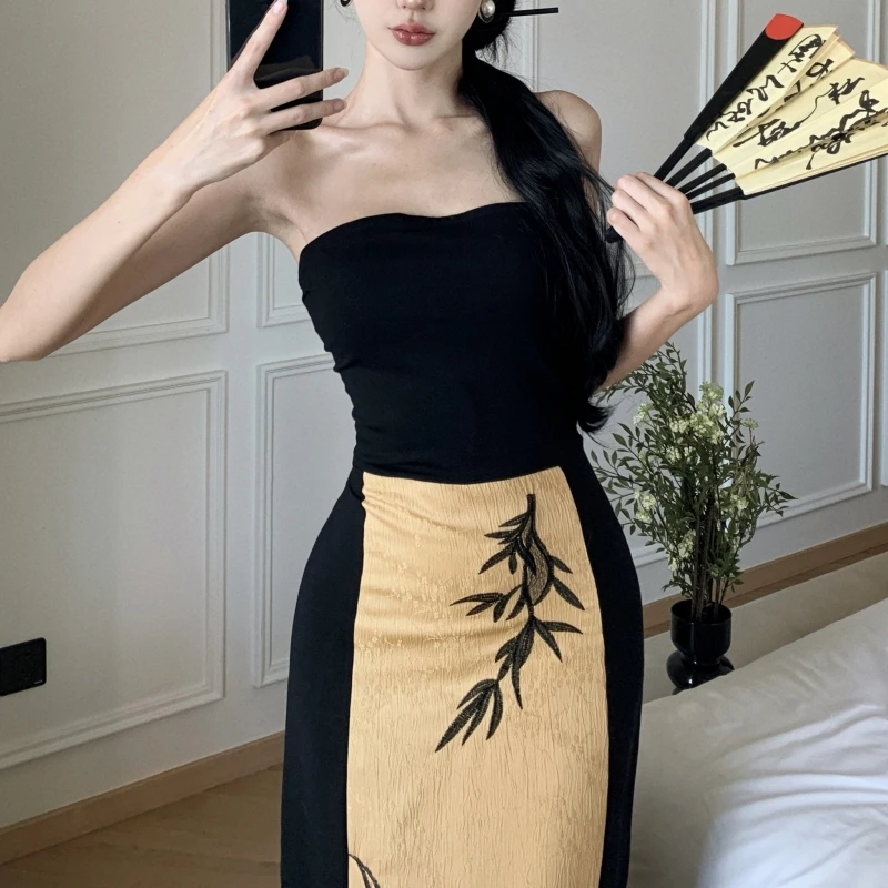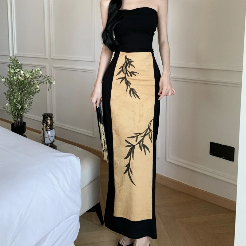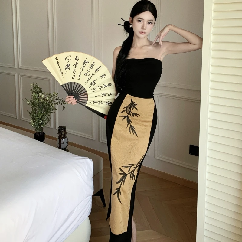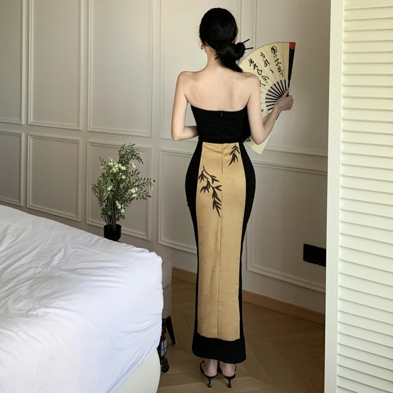New Style Chinese Style Strapless Casual Dress with Elegant Long Skirt Sexy and Stylish