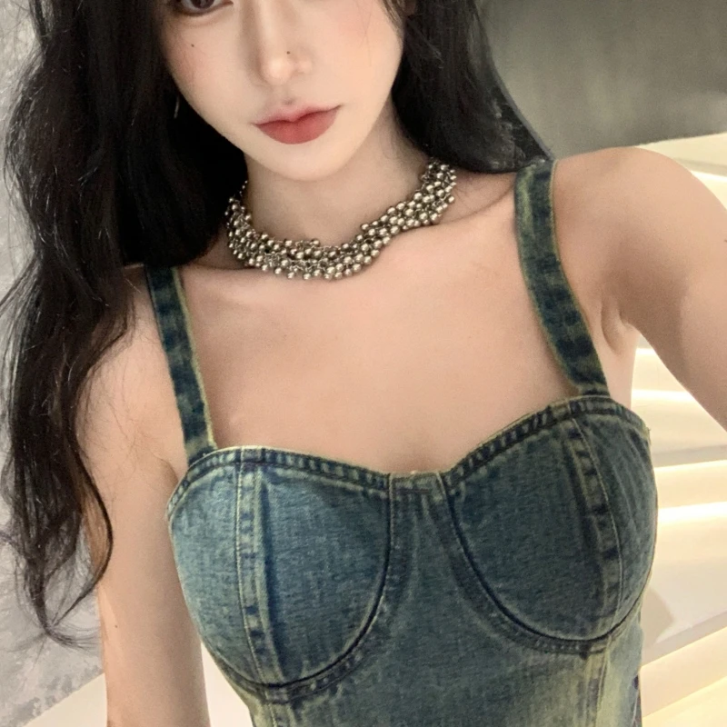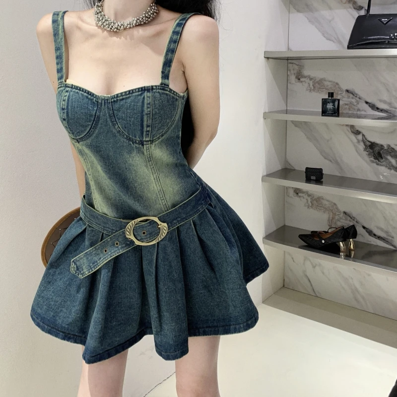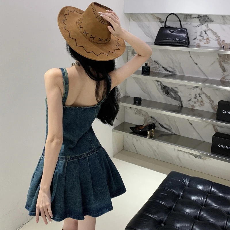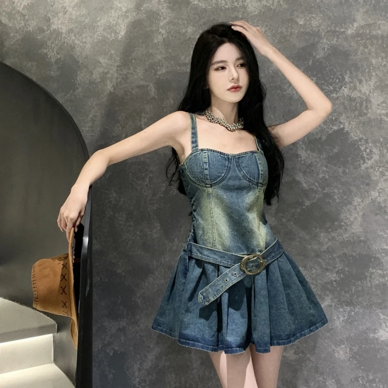 2025 Fashion Casual Spring Y2K Strapless Tunic Casual Mini Dress for Women Ruffled Denim Dress