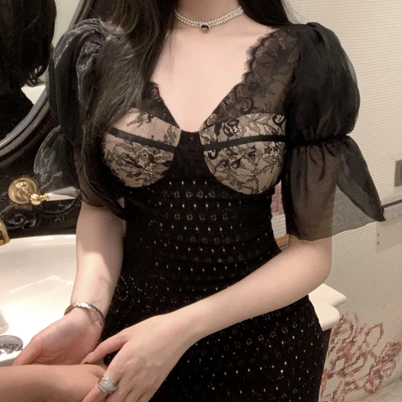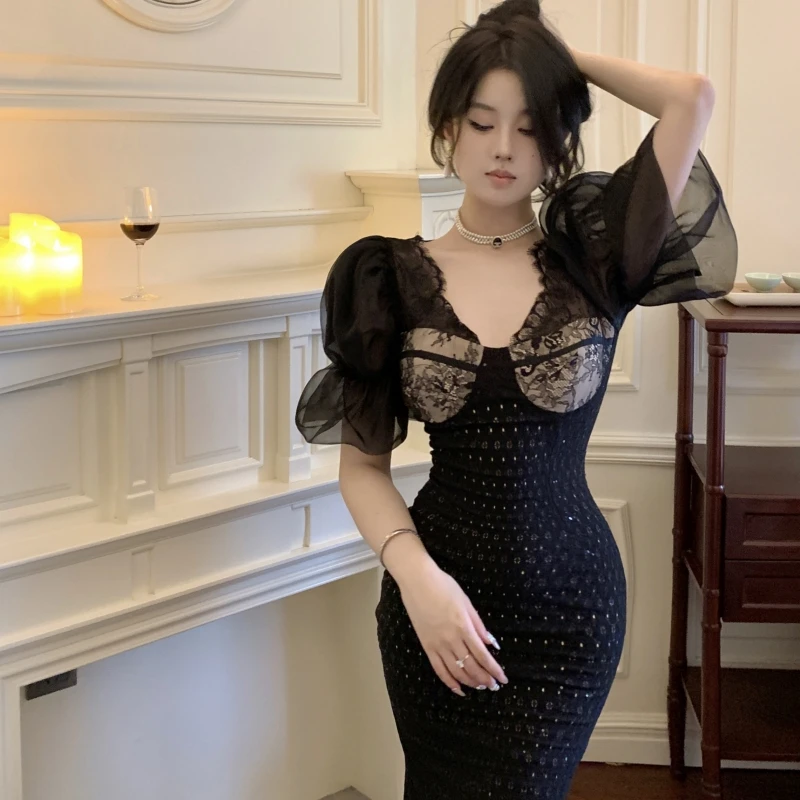 ZYHT 21541 Wholesale Crew Neck High Waist Casual Dresses Elegant Lace Velvet Mermaid Hem Ruched Long Sleeve Dresses for Women