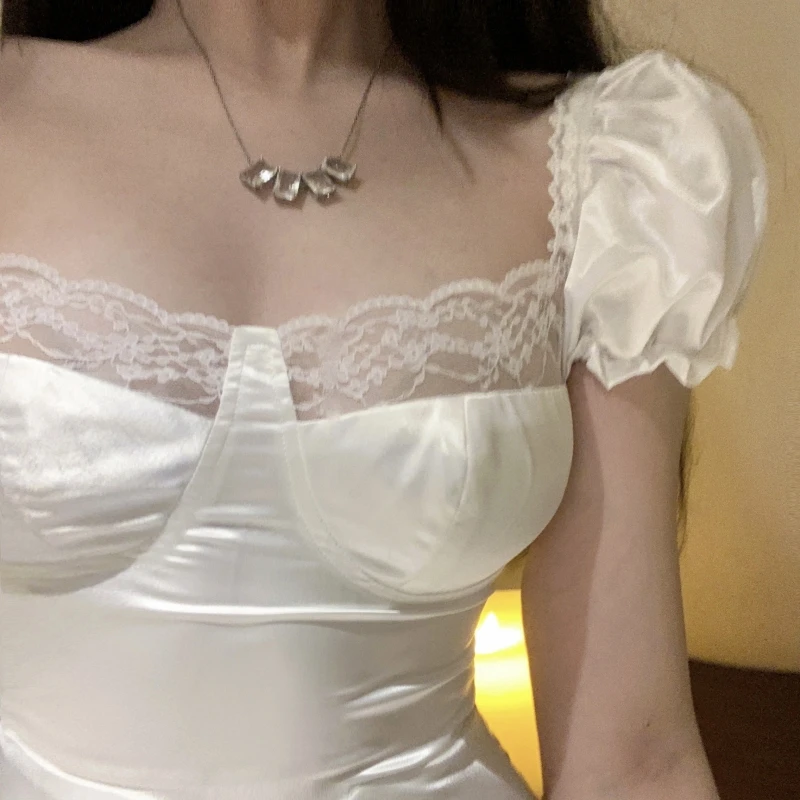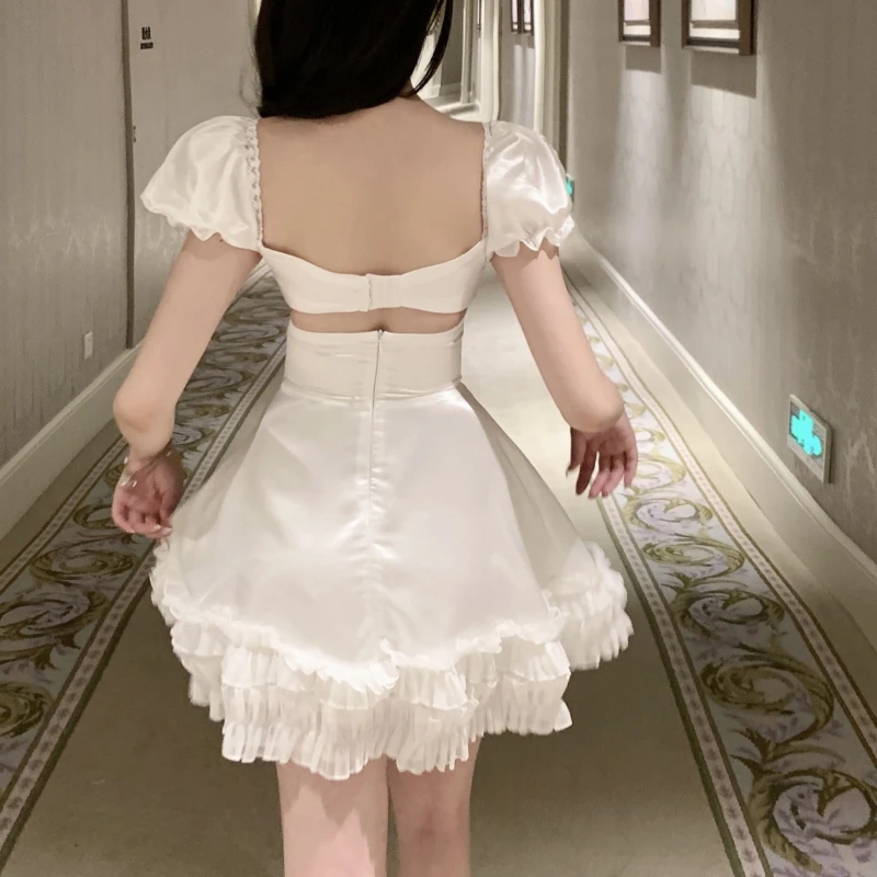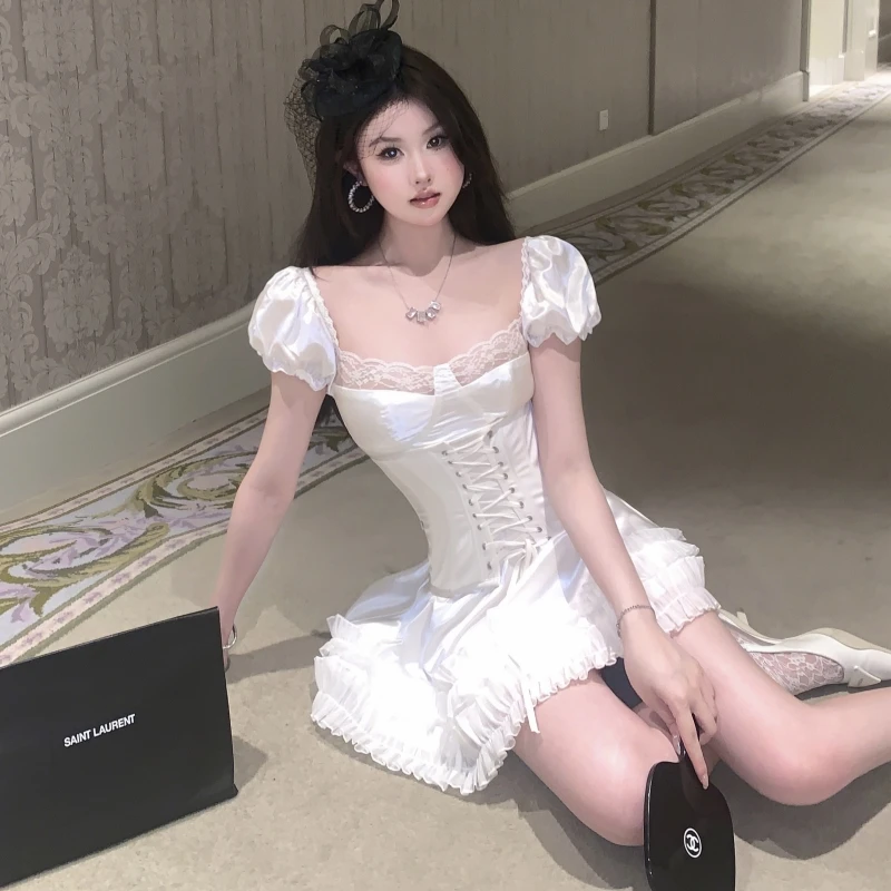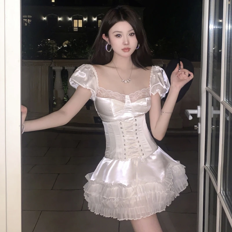 Woman's Satin Elegant Medieval Retro Mini Dress Corset Top Mini Skirt Y2K 2 Piece Sets Women Outfit Sexy Crop Lace Bandage Dress