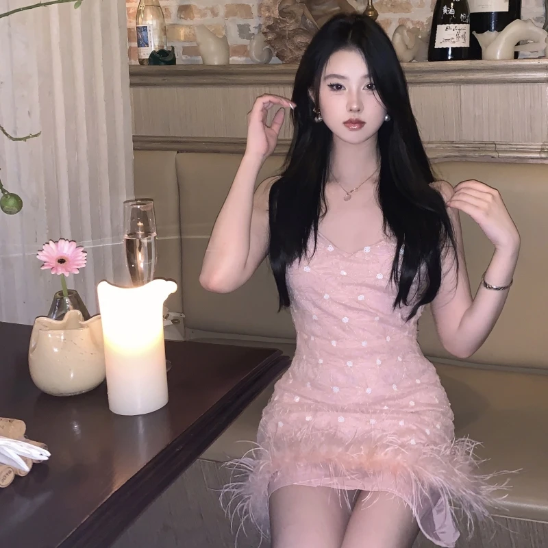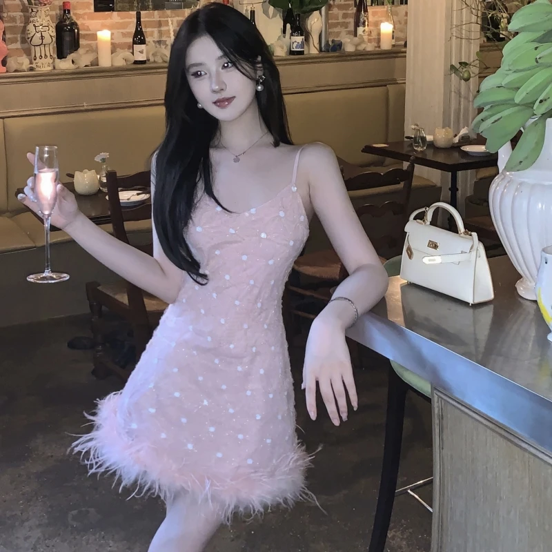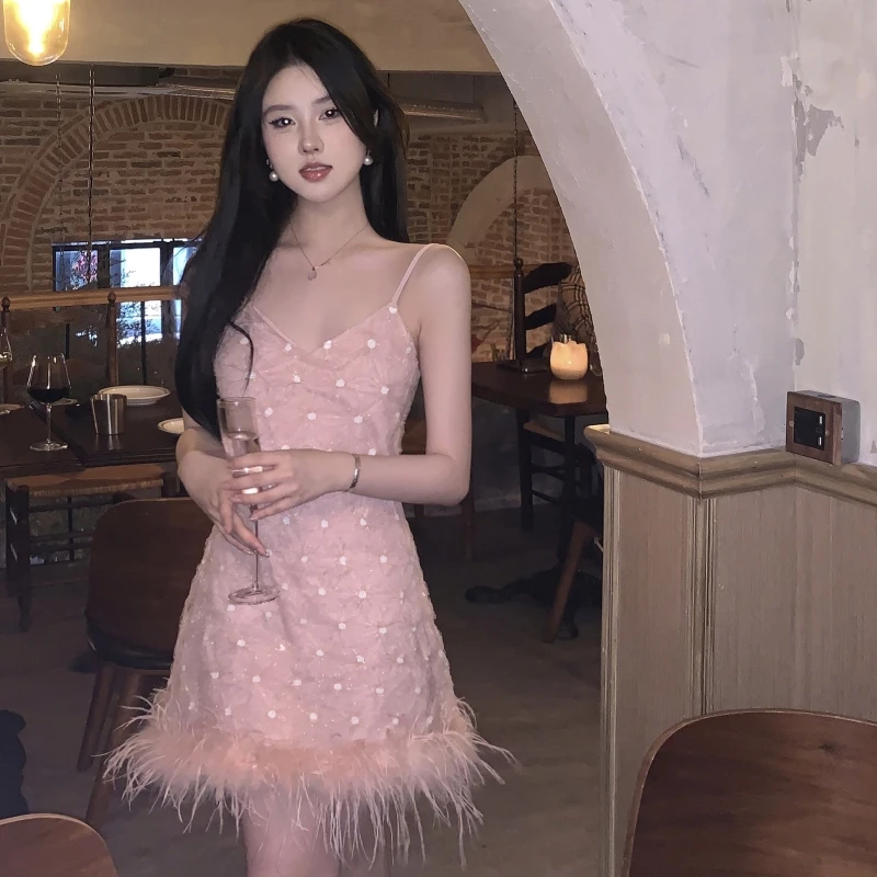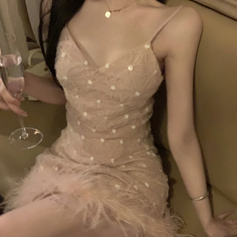 New Fashion Tassel Sequin Feather Stitching Sparkling Dress Halter Skirt Sexy Deep V Summer Women Sleeveless Dress