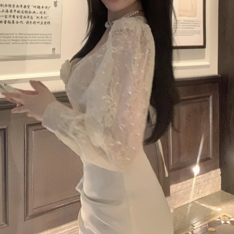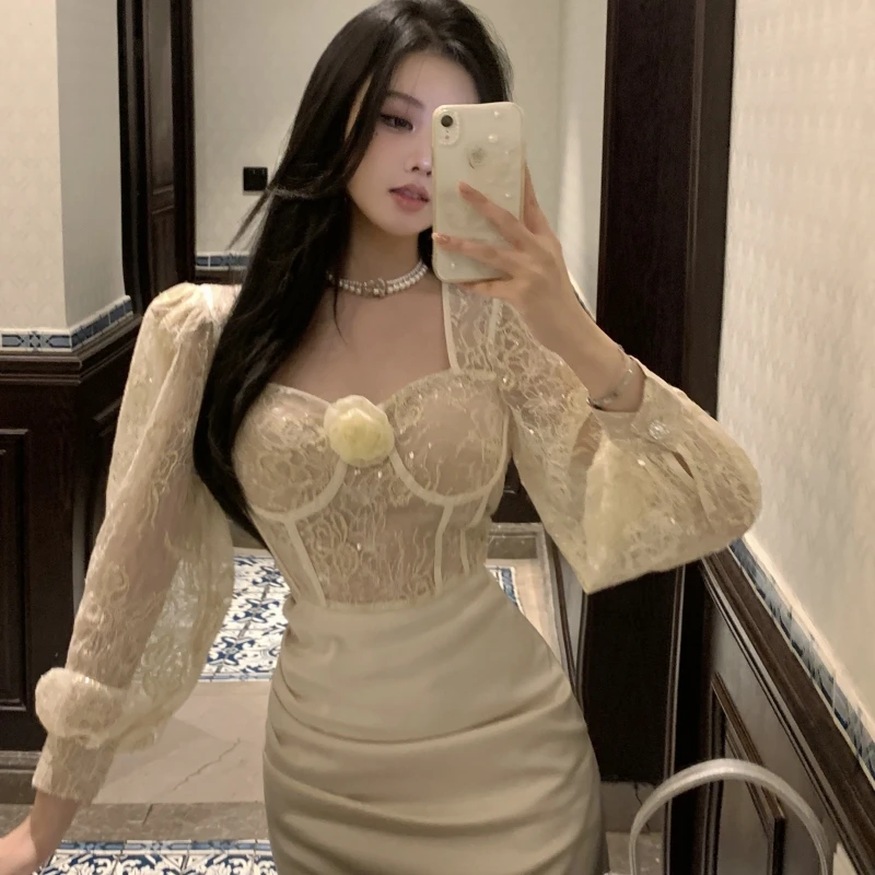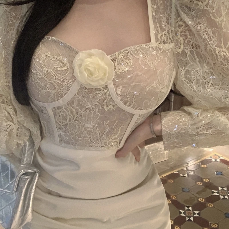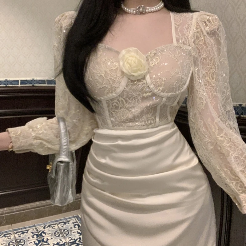 Spring Square Collar Roman Knee-Length Dresses for Women Flare Sleeve Empire Diamonds Lace Dress