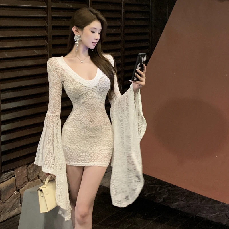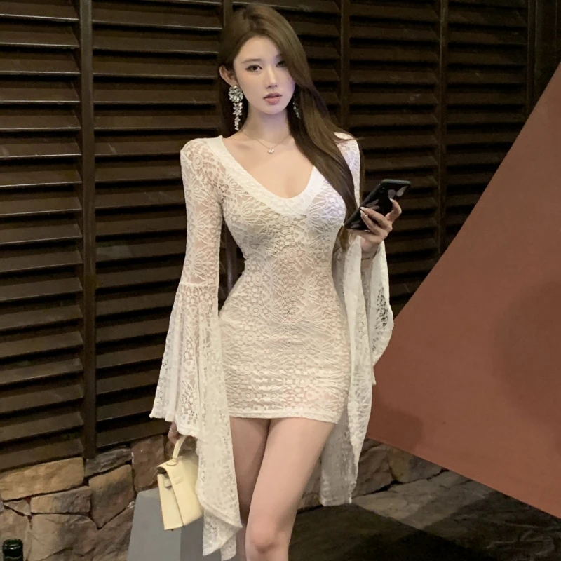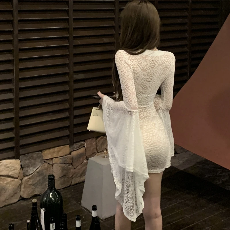 V-Neck Slim Slip Mini Dress for Women Flare Sleeve Empire Lace Dress