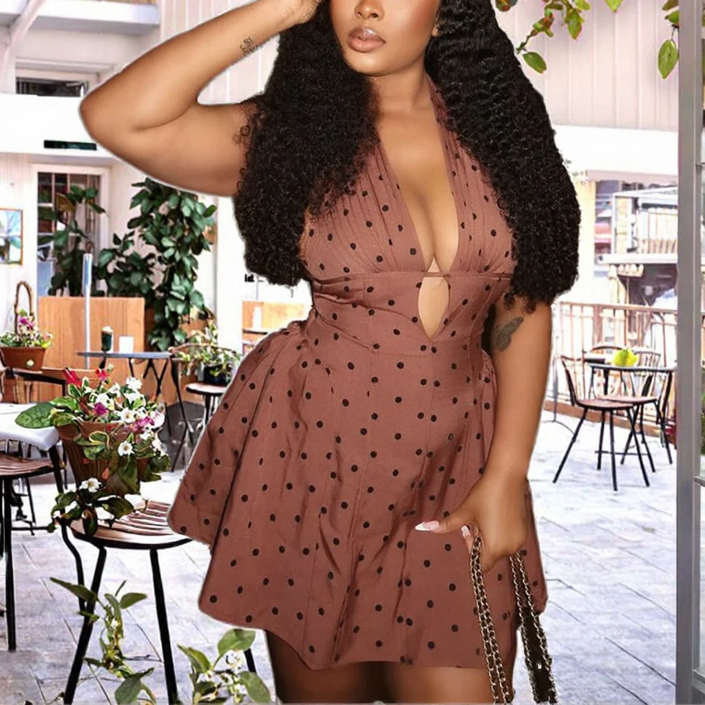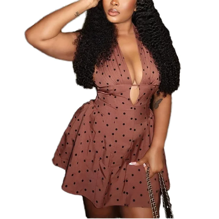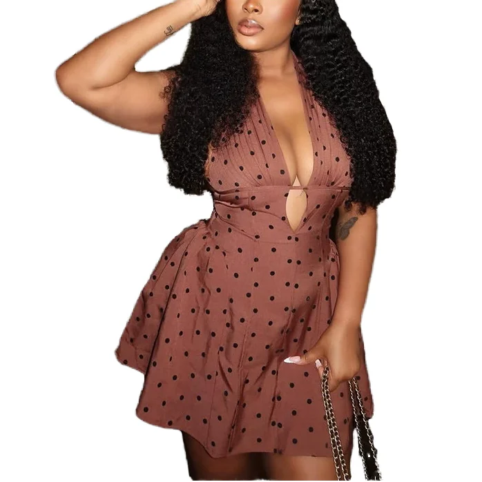 Customize Brown Autumn Mix Natural Trendy Sexy Backless Pleated Slit Polka Dots Skirt Casual Sleeveless Ruffled Dresses Bud