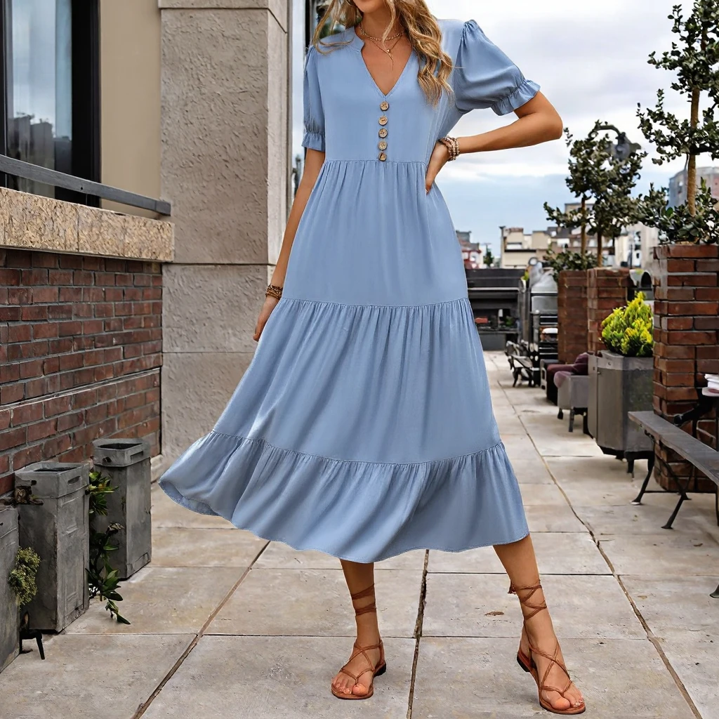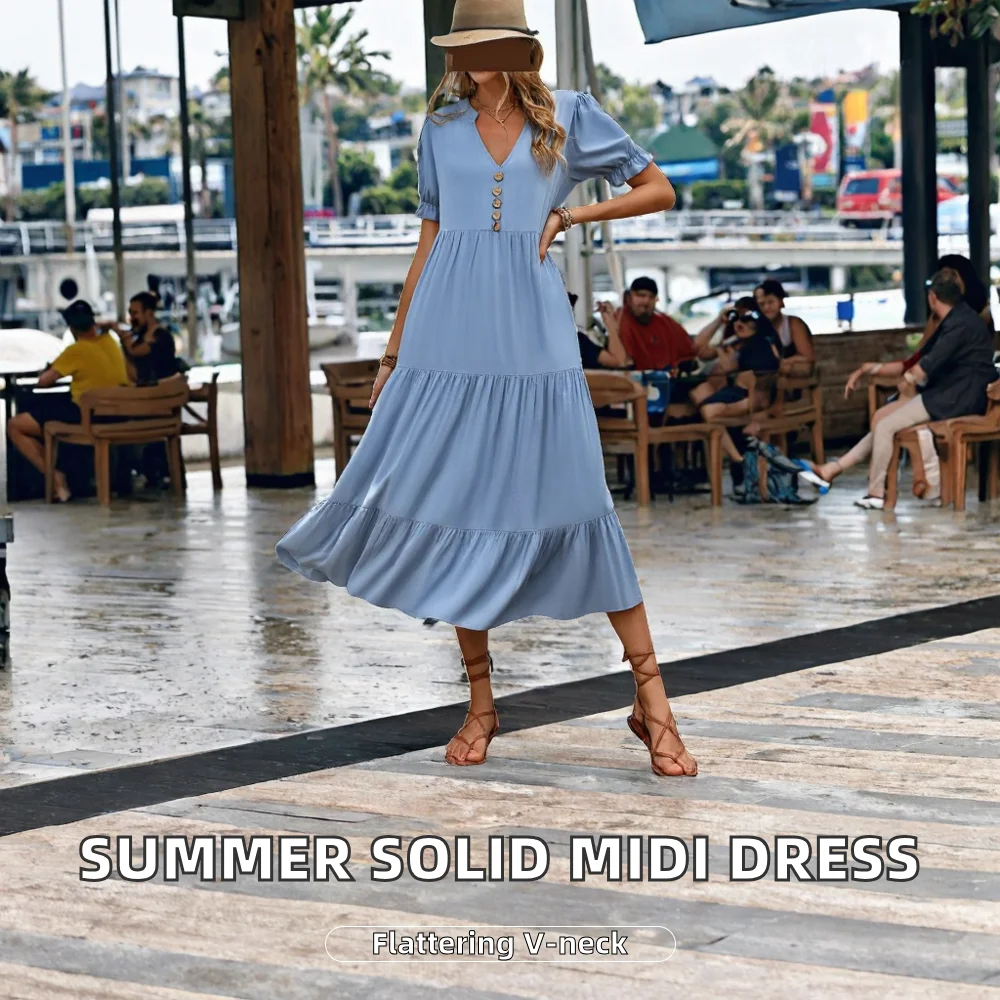 Customize New European American Summer Casual Woven Button Anti-Static Natural Waist A-Line Solid Color Midi Dress