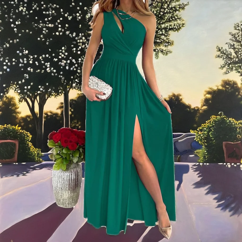ZYHT 73849 European Wholesale Fashion Casual One Shoulder Ruched Maxi Dress Side Slit Pleated Long Sleeve Dresses for Women