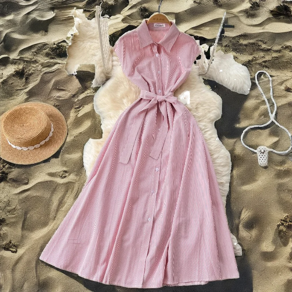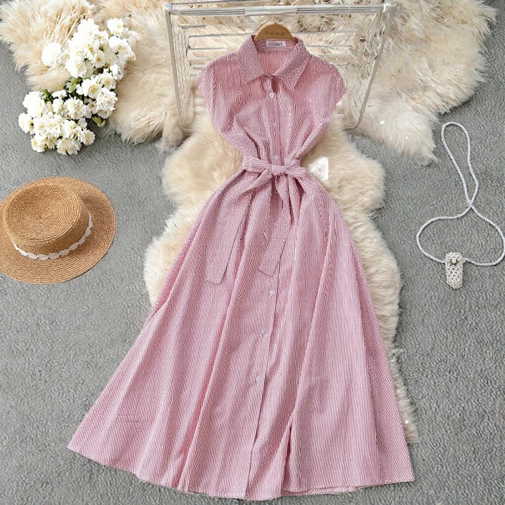 Customize Korean Fashion Empire Waist Romantic Sleeveless Striped A-Line Midi Dress with Sashes Women Summer Slimming