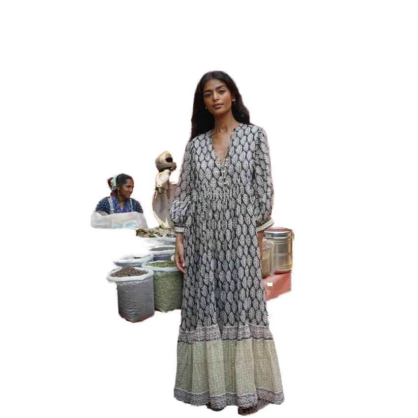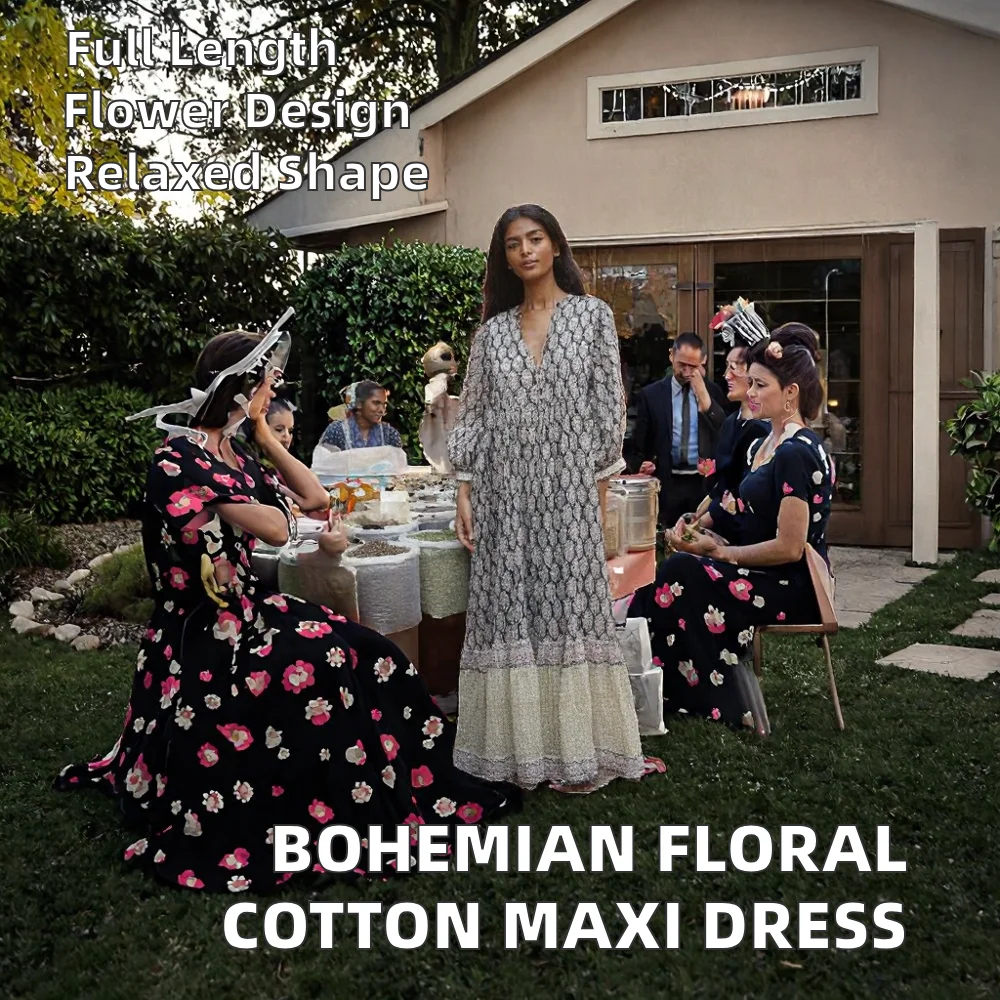 Customize Service High Street Office Lady Bohemian Digital Printed Cotton Dress Long Sleeve Floral Indian Ethnic Eco-Friendly