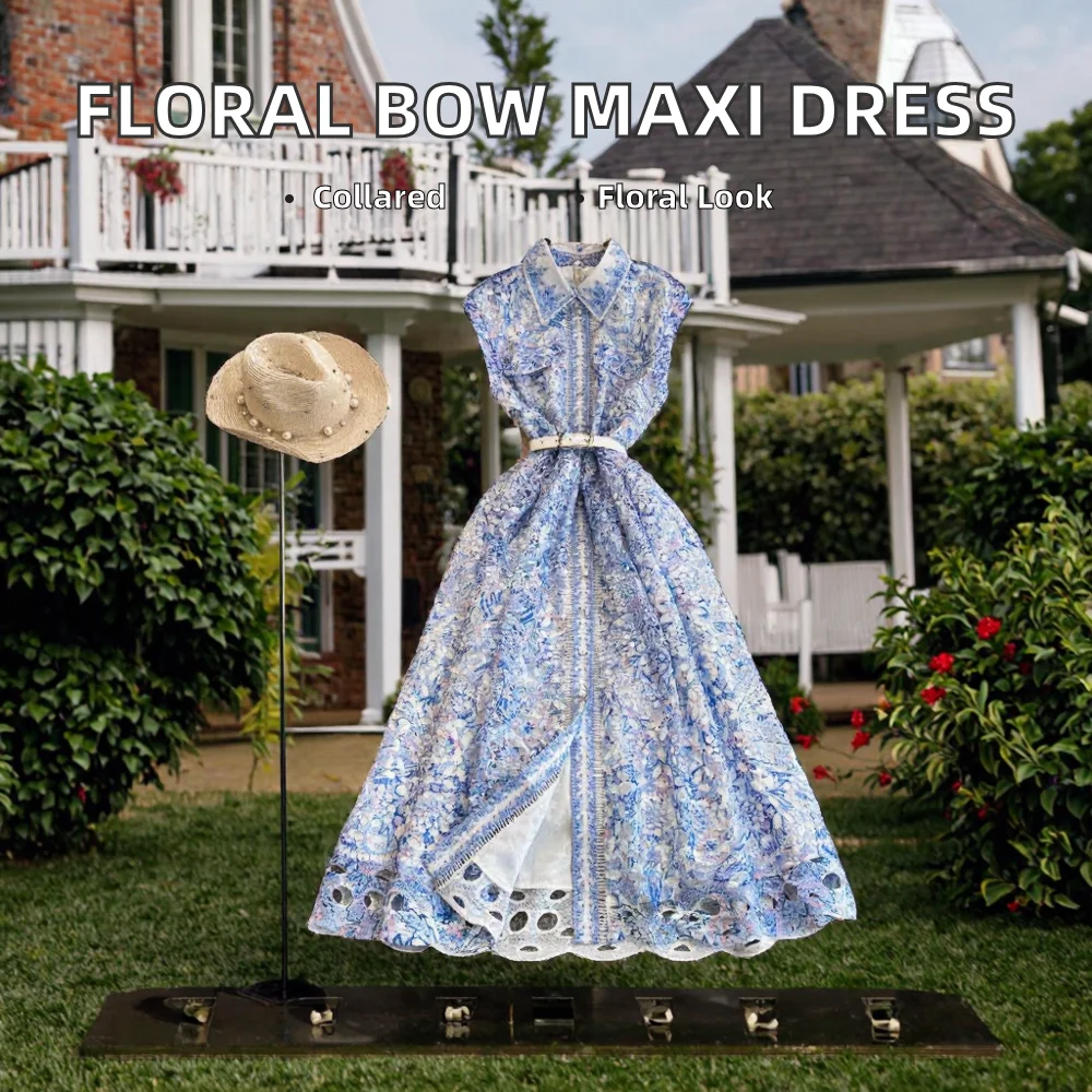Customize Chiffon Maxi Dress French Elegant Romantic Floral Print Sleeveless A-Line Summer Dress Bow Detail Natural Waist
