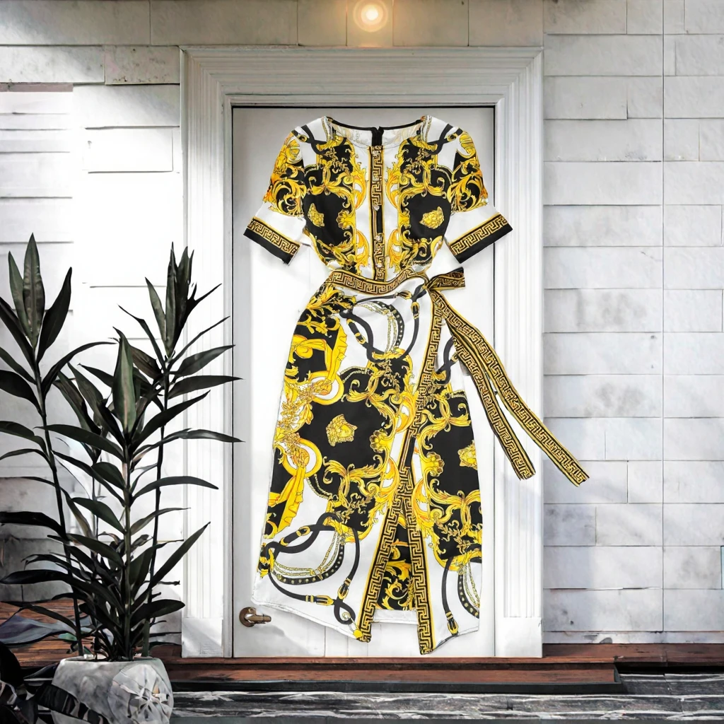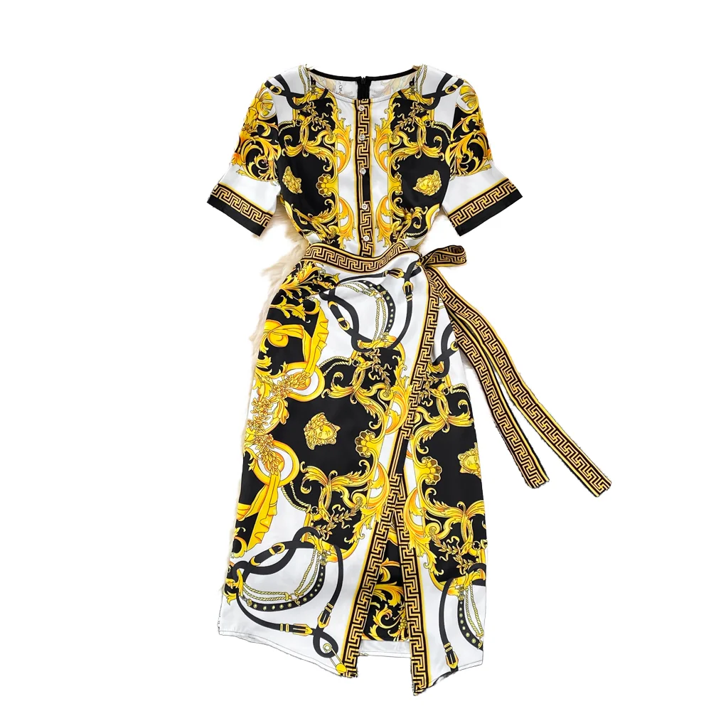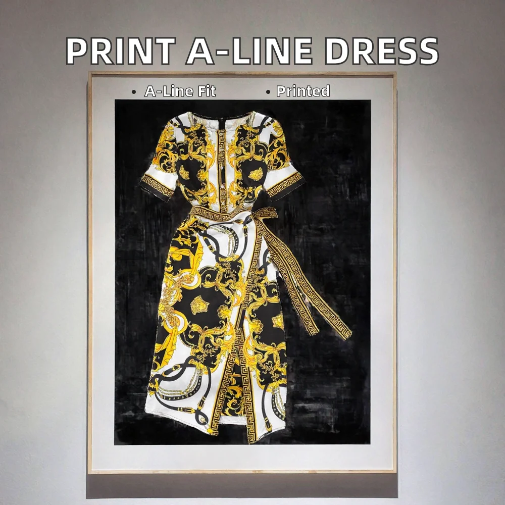 Customize Casual Dress with Neck Short Sleeve Asymmetrical A-Line Print Eco-Friendly Digital Woven Empire Waistline Midi Length