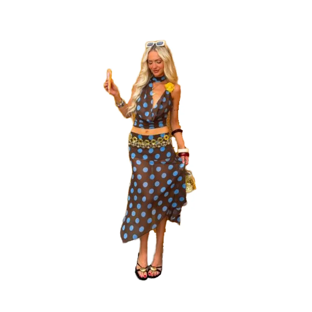 Customize New Sexy Two-Piece Set Short Casual Print Top Bow Collar Mesh Hanging Neck Suspender Skirt Swing Neck Scarf Style