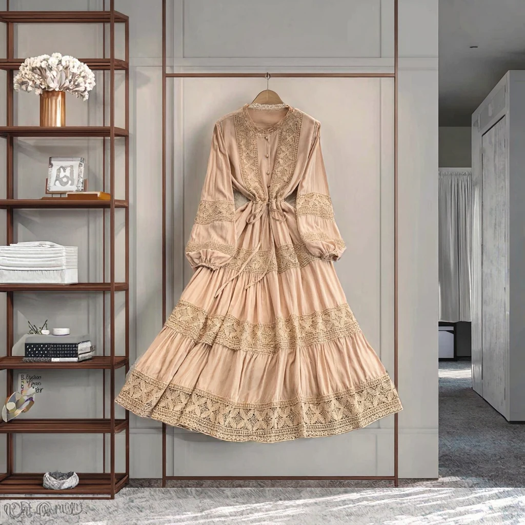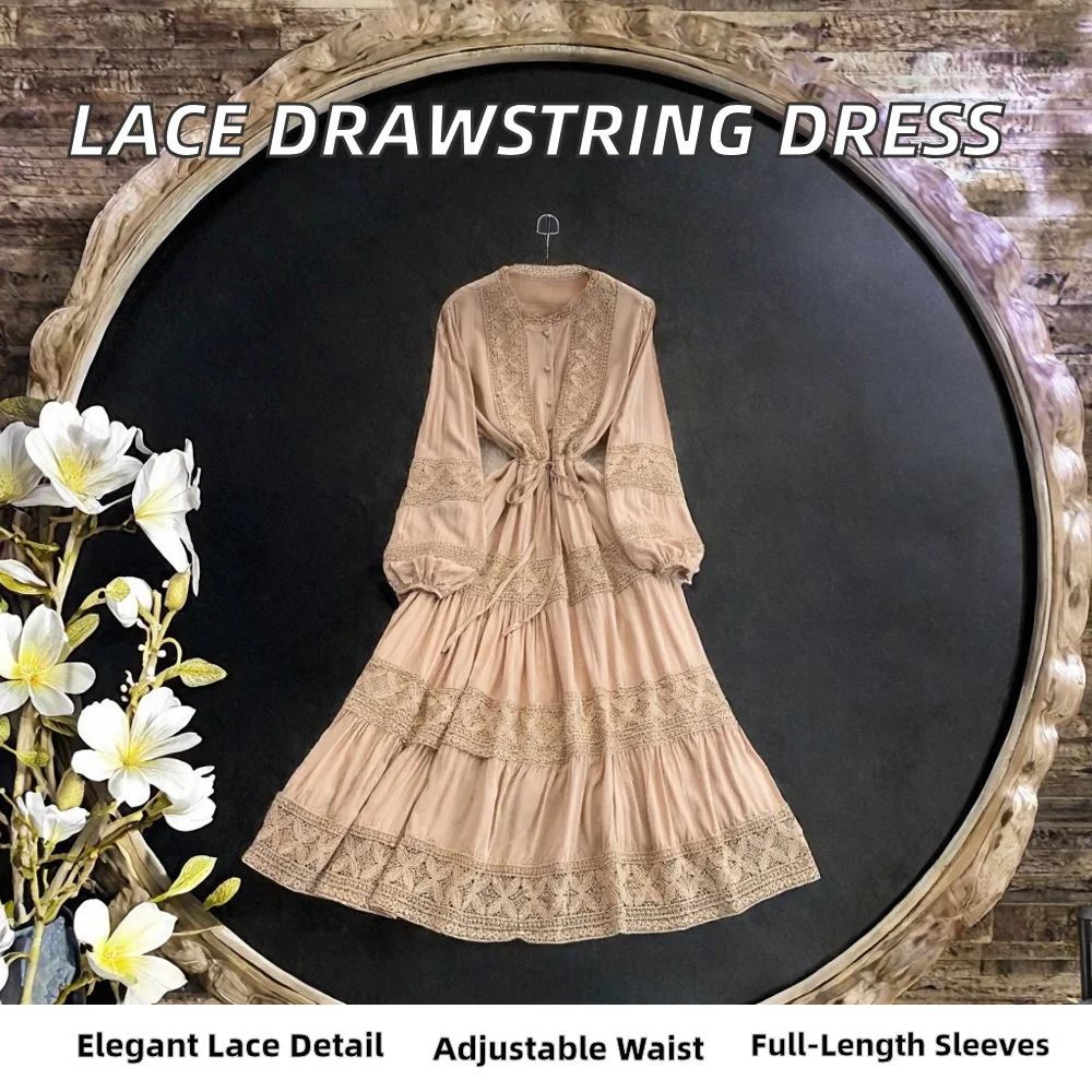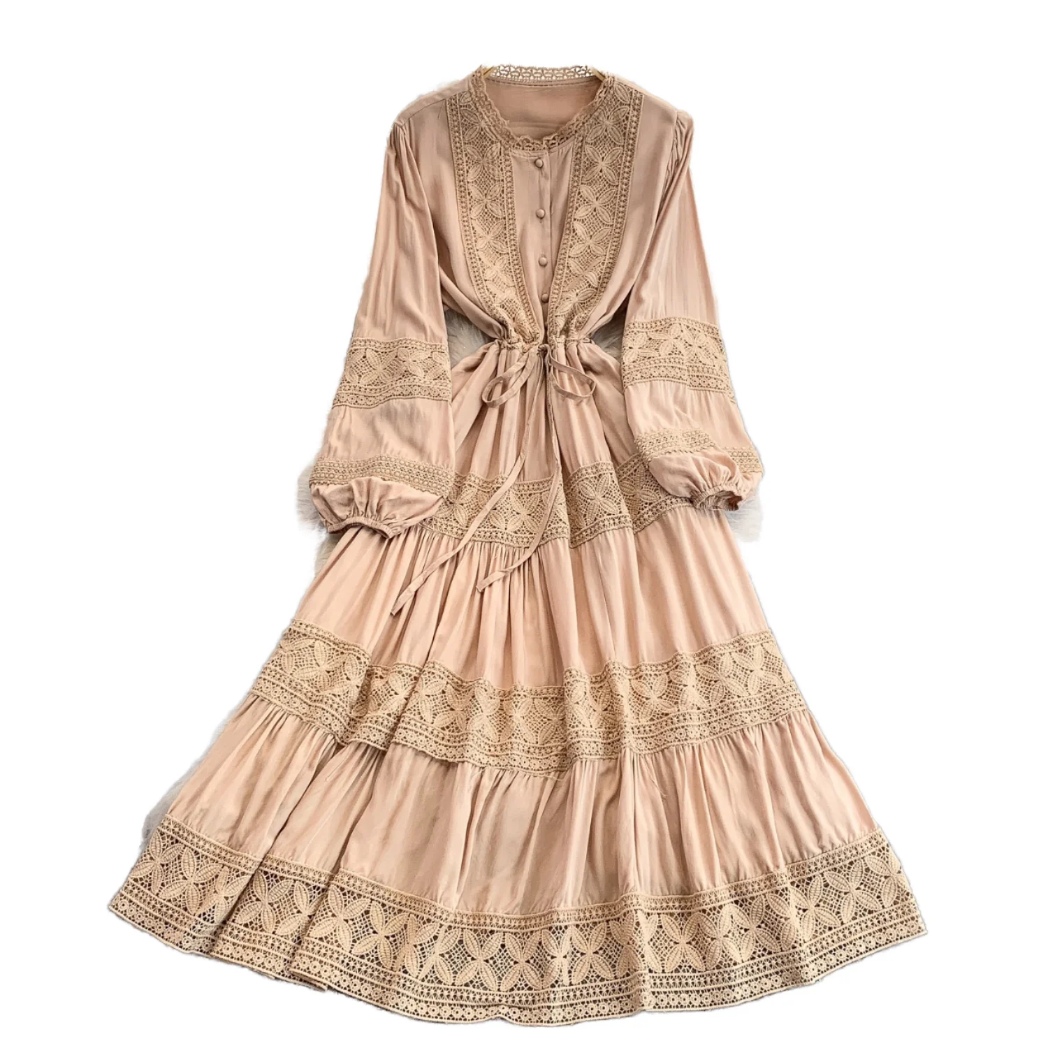 Customize Spring/Autumn Crocheted Button-Up Drawstring Cake-Style Lace Patchwork Solid Round Neck Long Sleeve Party Dress
