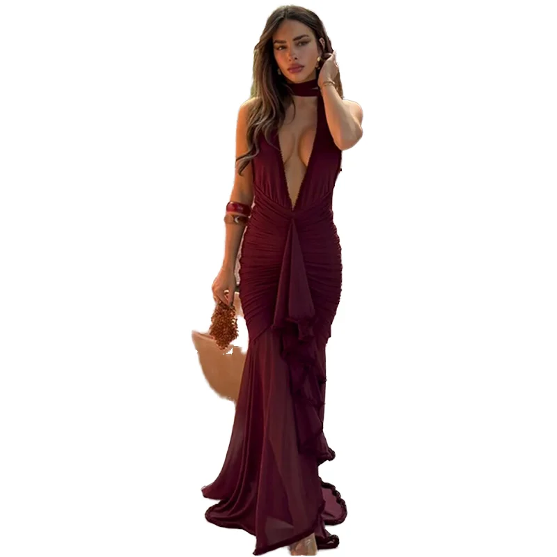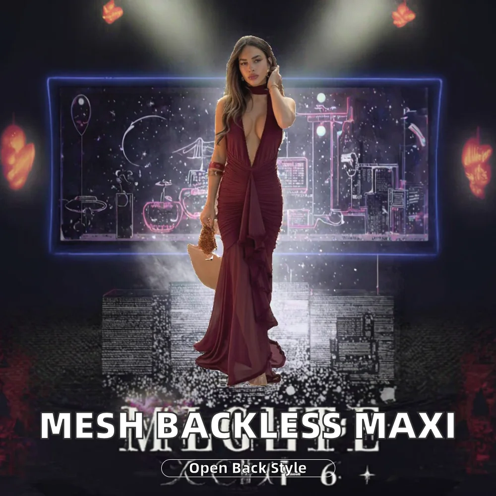 Customize New Arrival High Street Sexy Solid Dropped Waist Plain Dyed Mesh Backless Party Maxi Dresses Women