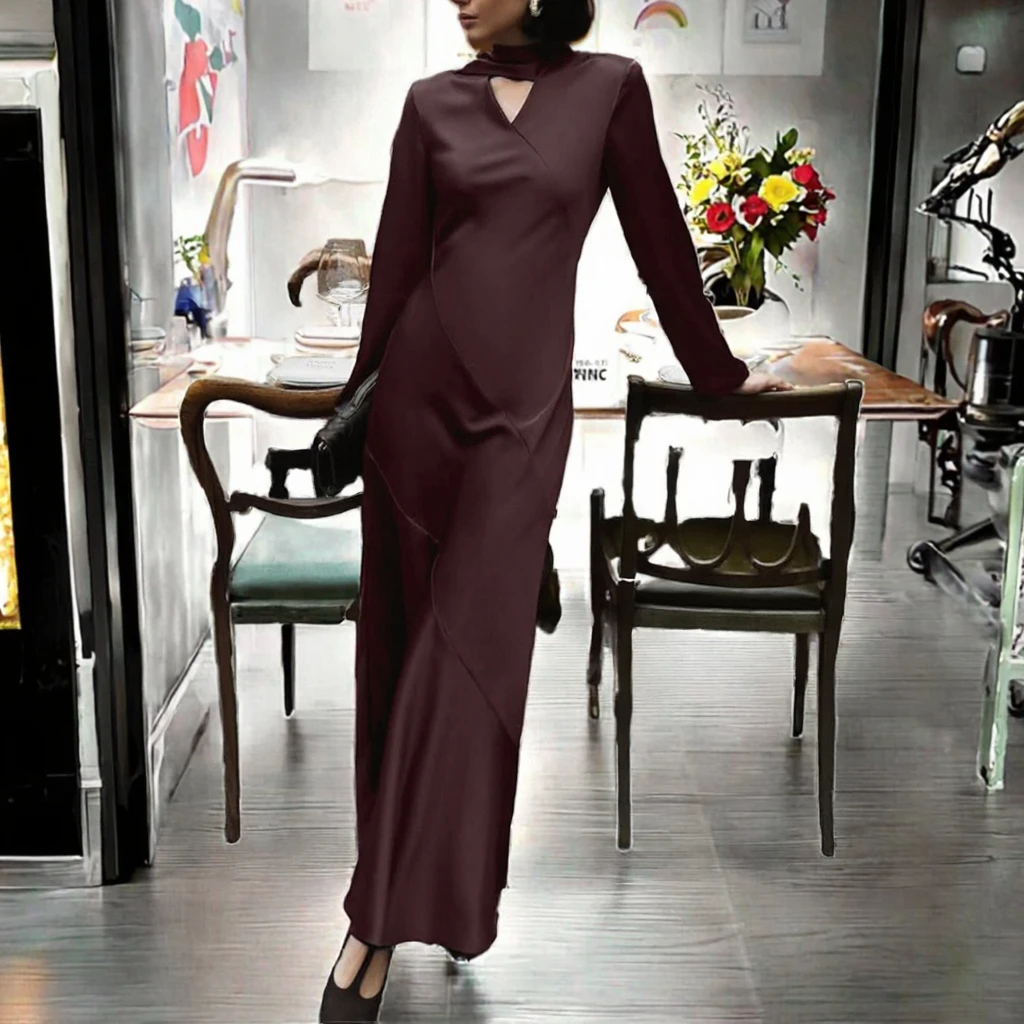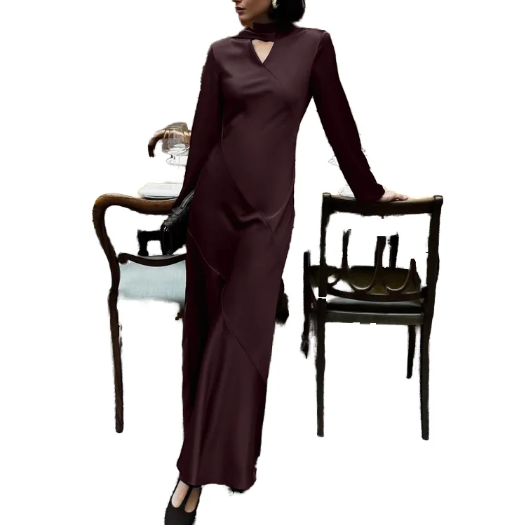 Customize Side Zipped Breathable 2025 Autumn Satin Slim Elegant Women's Maxi Long Party Evening Dress Burgundy with Sleeves