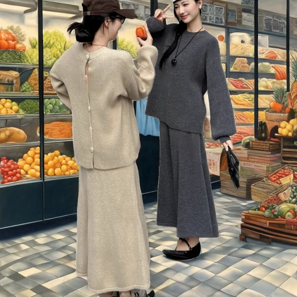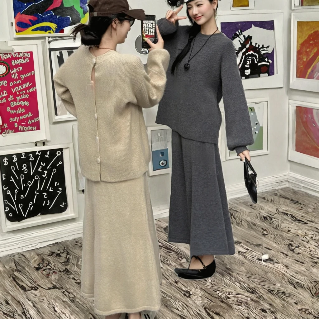 Customize New Korean Style Solid Pattern Loose Button-Down Round-Neck Knit Casual Top Skirt Two-Piece Suit for Autumn Women