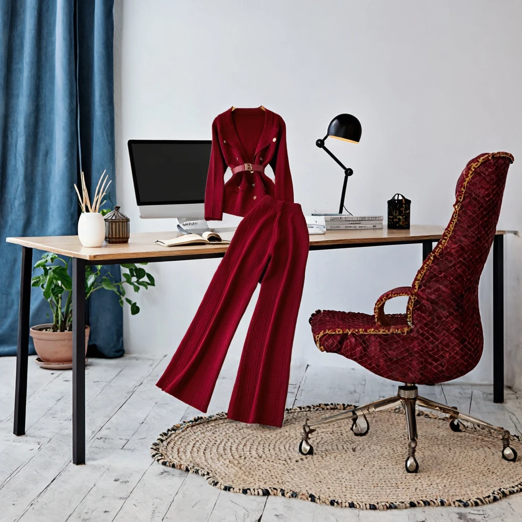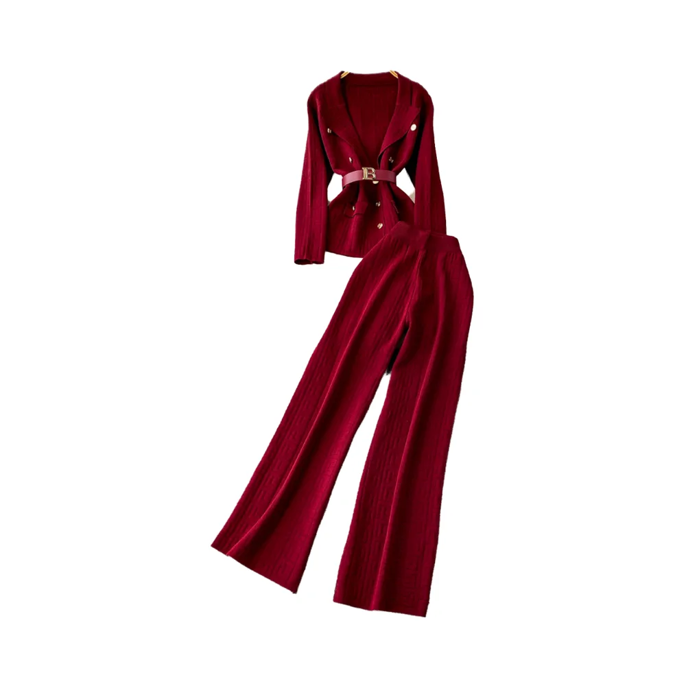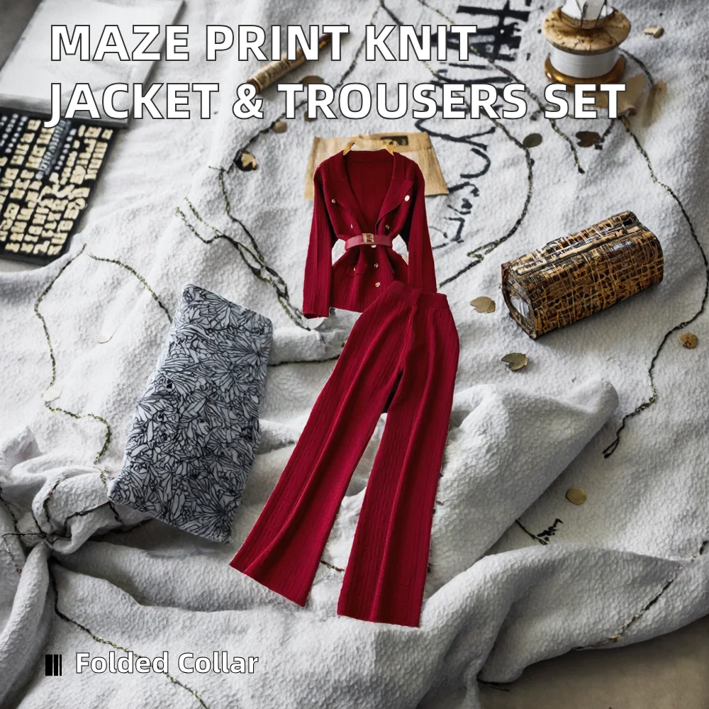 Customize Elegant Two Piece Set Ladies Tie Waist Maze Print Notch Lapel Woven Jacket + High Waist Trousers Sweat Suit