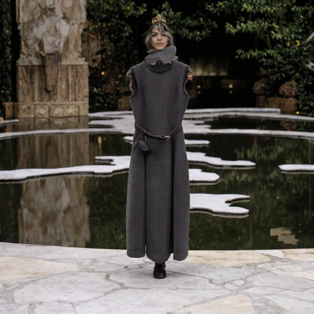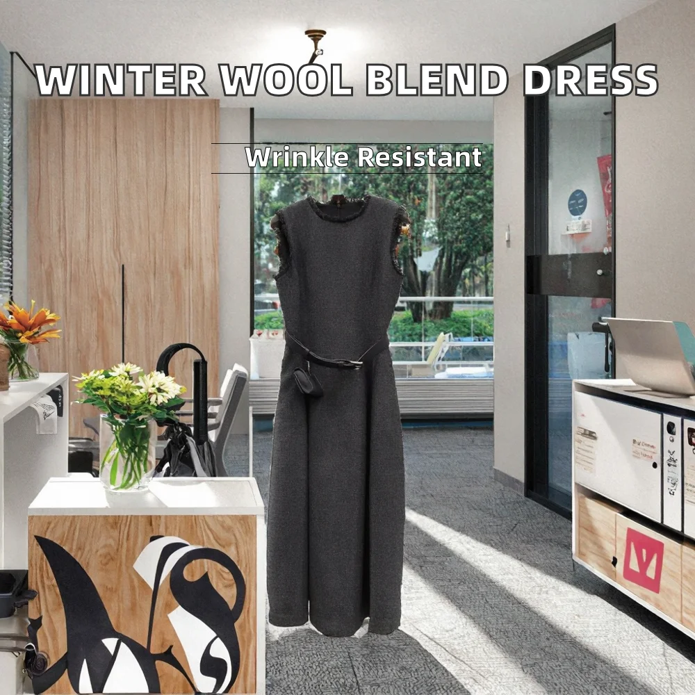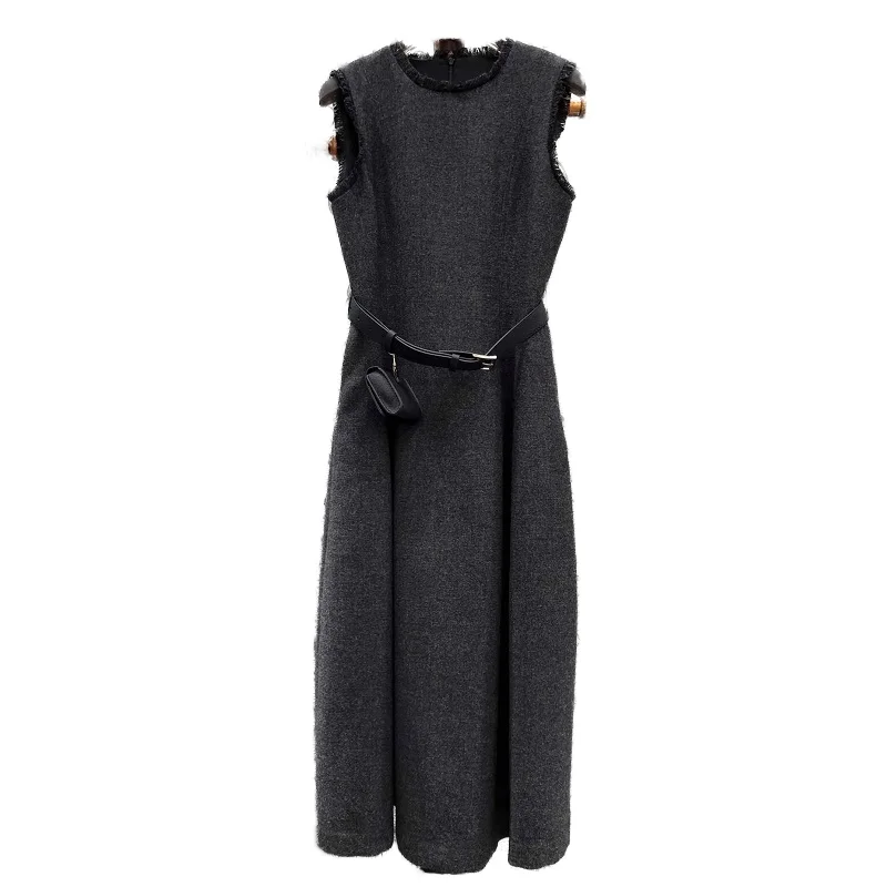 Customize High Quality New Winter Dress Fashion Designer Empire Waist High Street Belt Patchwork Sleeveless Midi Length Wool