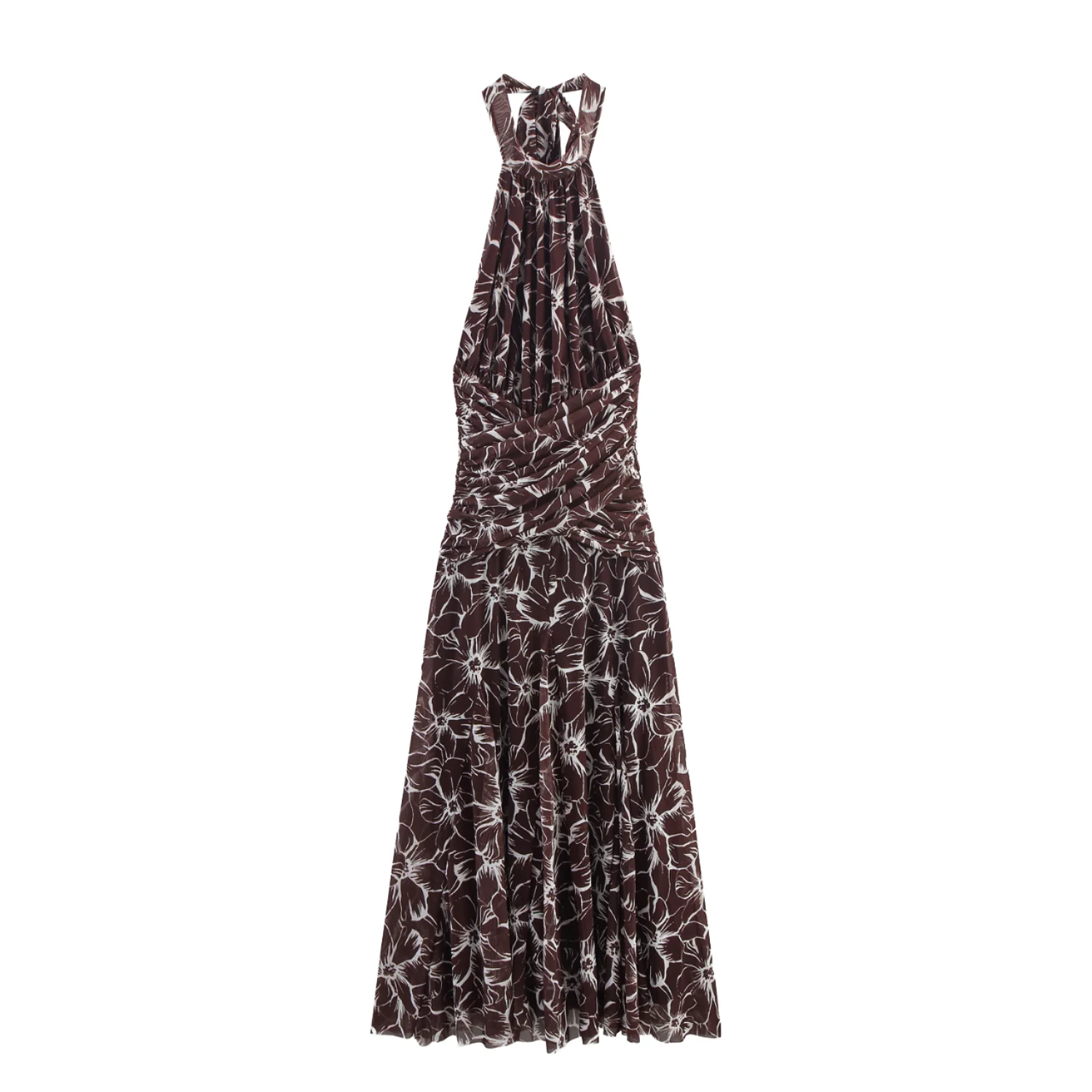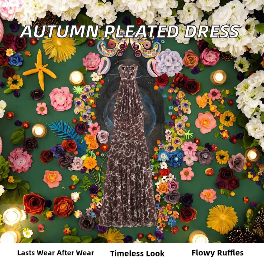 Customize Spring Summer Autumn New Arrival Vintage Pleated Decoration Bow Tie Halter Neck Printed Tulle Long Dress