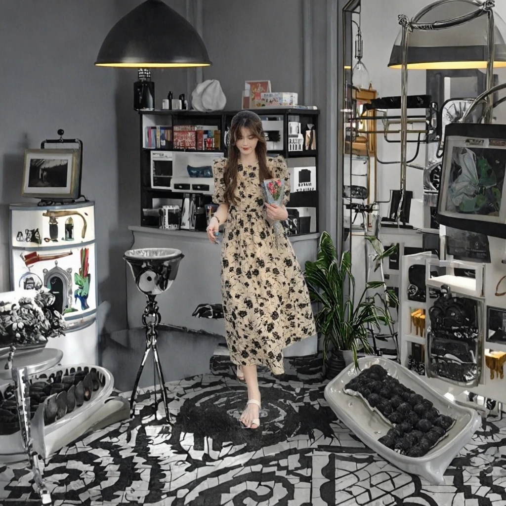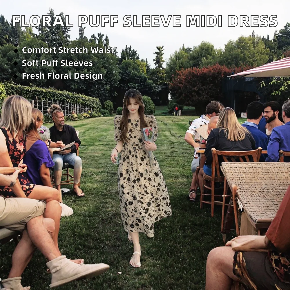 Customize Fashionable Women's Knee-Length Puff Sleeve Floral Printed Translucent Elastic Waist Cute Sexy Dress