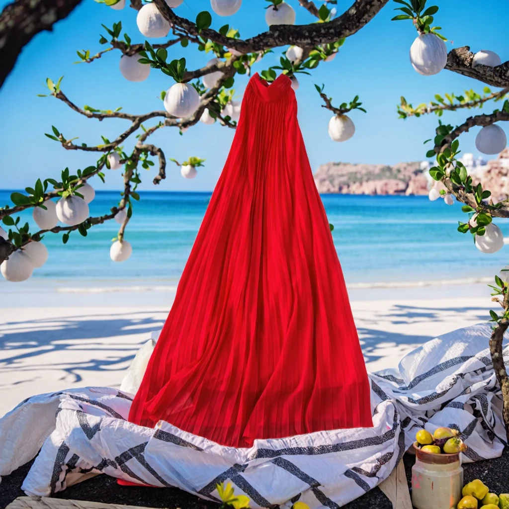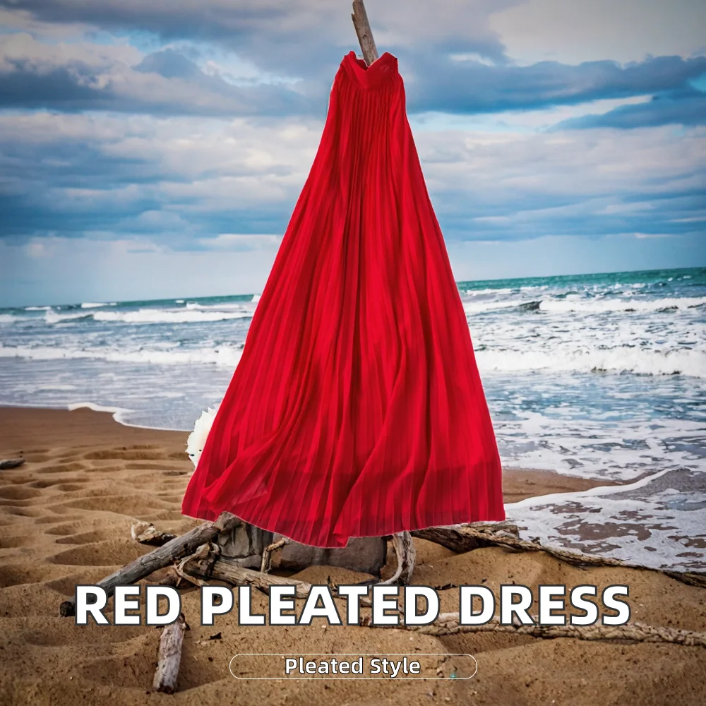 Customize New Fashion Red Translucent Solid Maxi Dress Pleated Spaghetti Straps Halter Lady Seaside Vacation Style Beach Women's