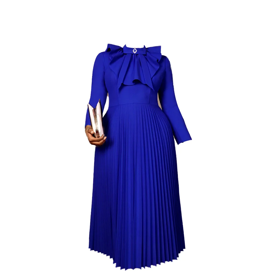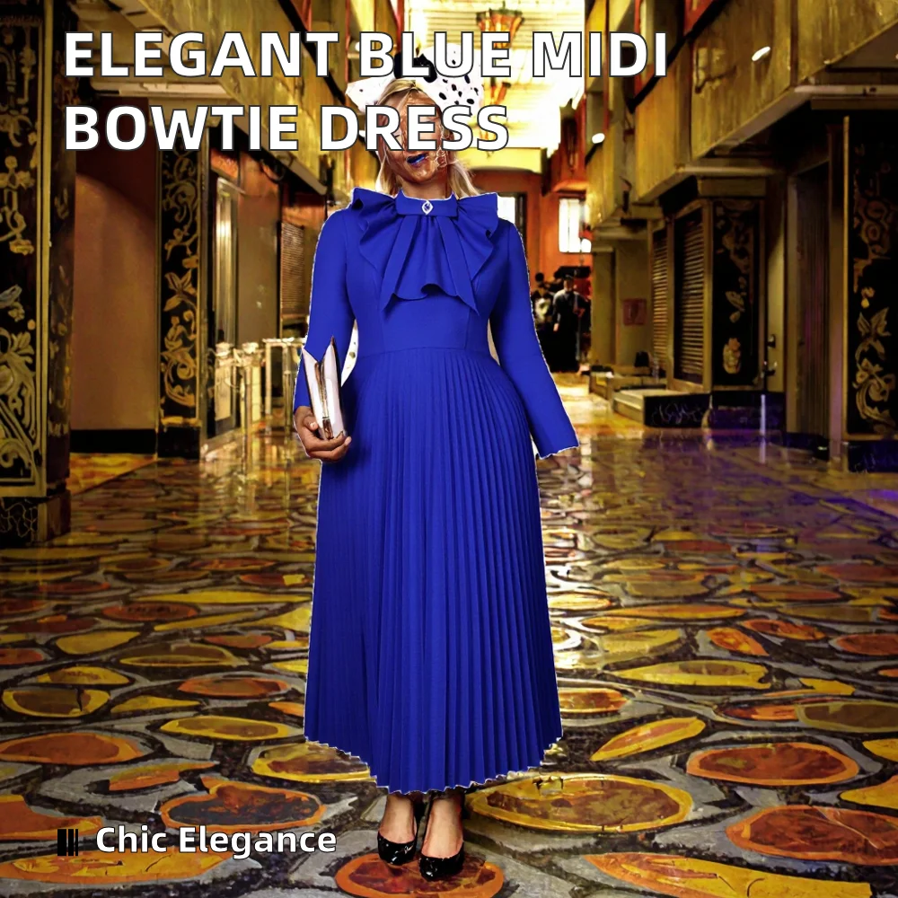 Customize Elegant Fall Stand Collar Bowtie Long Sleeve A-line Pleated Blue Midi Plus Size Empire Waist Zippers Formal Women's
