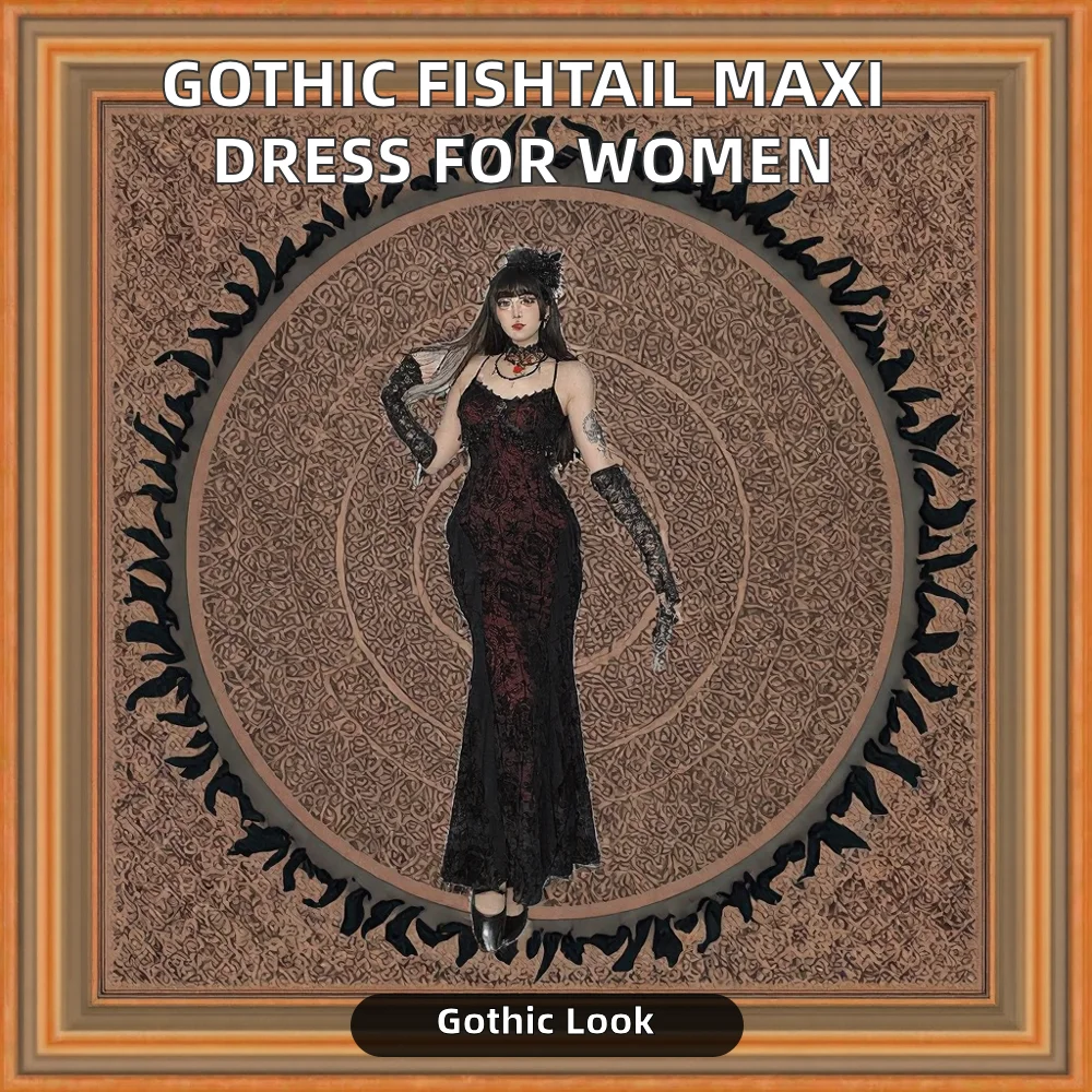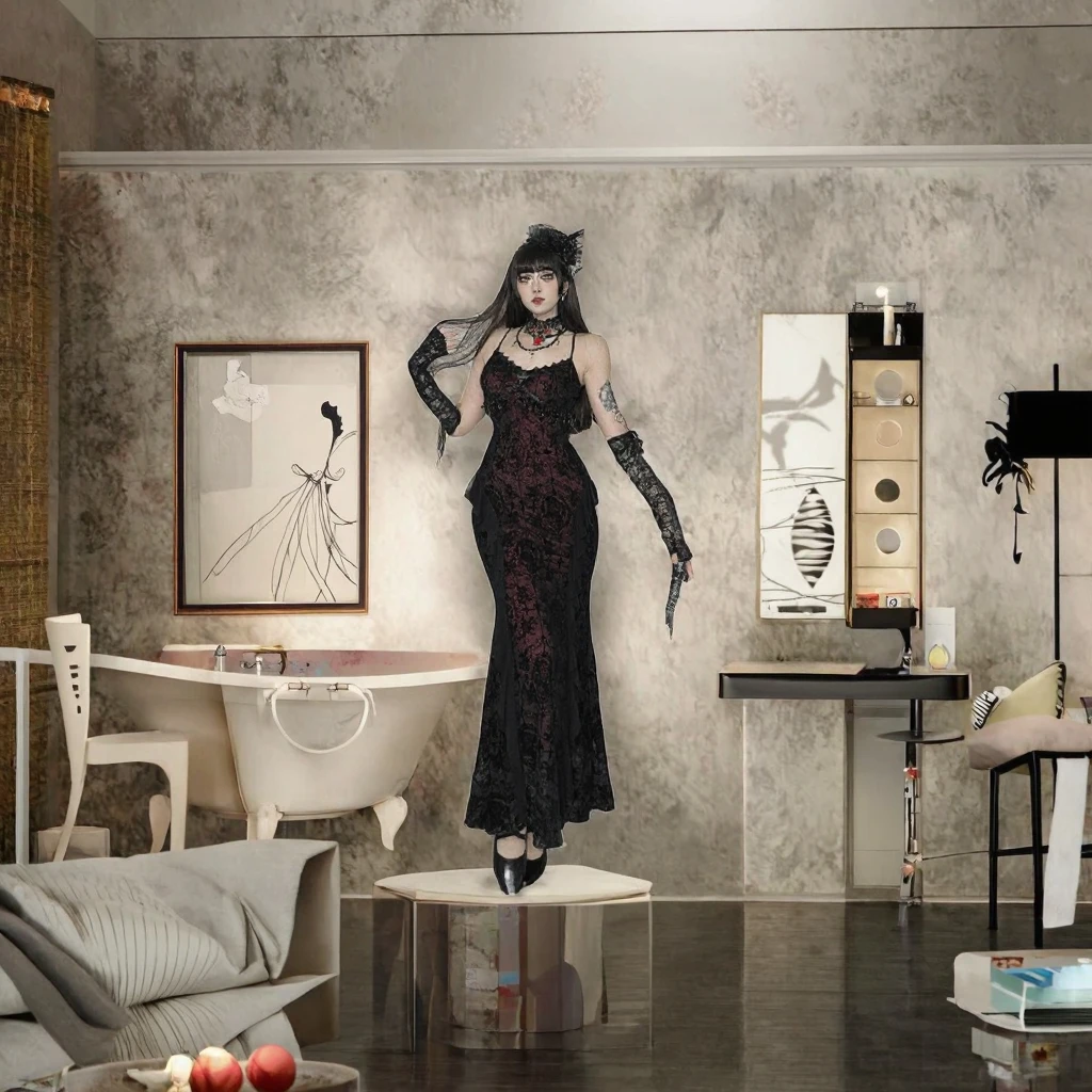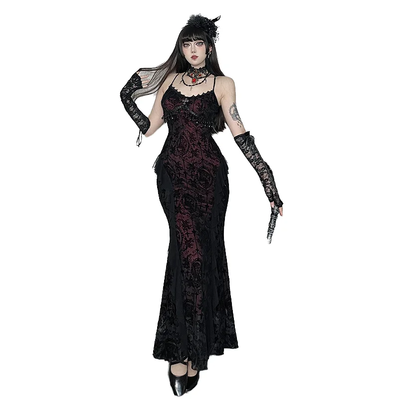 Customize Gothic Sexy Solid Lace Long Fishtail Robe Spaghetti Strap Sleeveless Backless Ruched Plain Dyed Vintage Maxi Dress