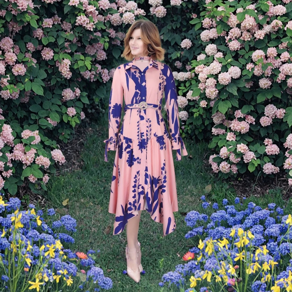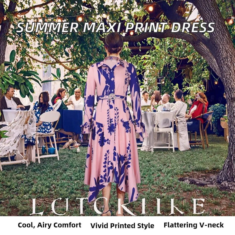 Customize European American Large-Size Autumn Casual Dress Maxi Length Temptress Digital Printing Breathable Irregular Lapel