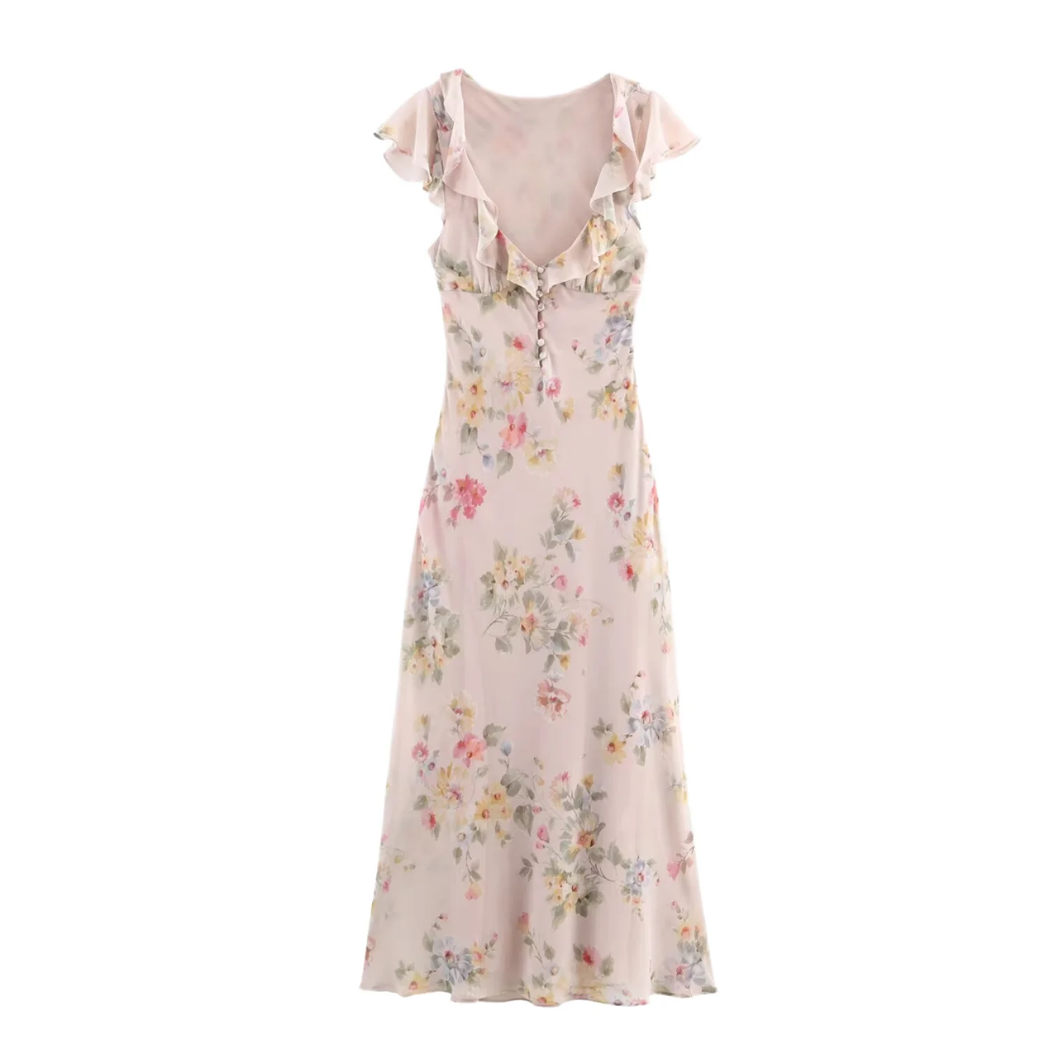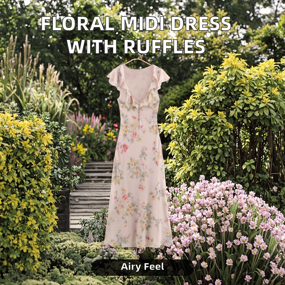 Customize Natural Woven Breathable Square Collar Floral Print Front Ruffle Button-Up Pink Casual Summer Midi Dress for Women