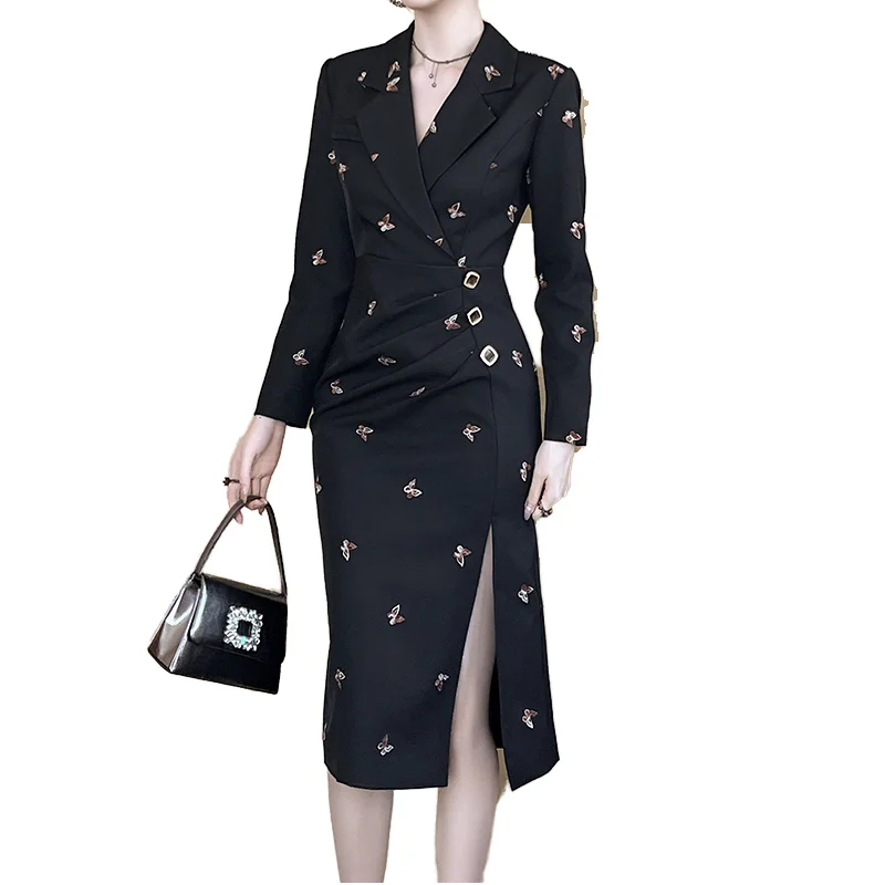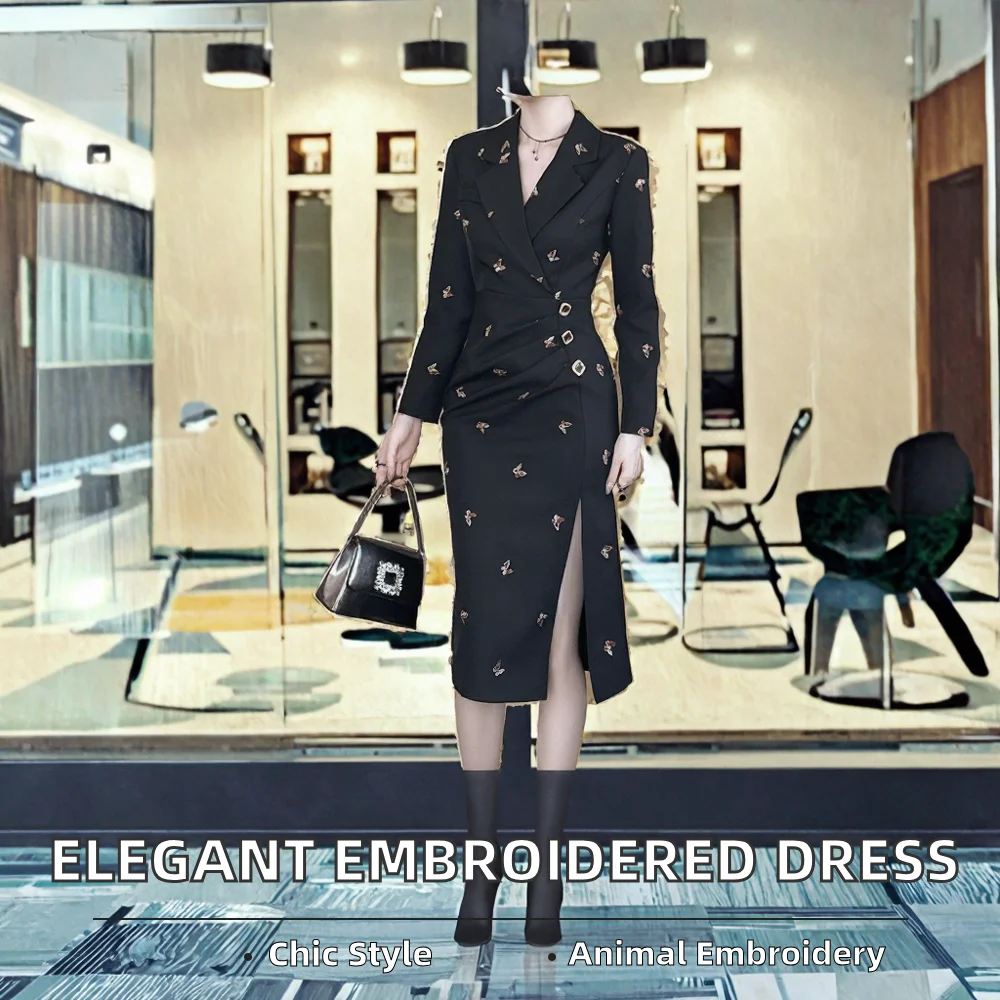 Customize Spring Autumn Winter Office Lady Ruched Mid-Length Embroidery Animal Fashion Breathable Professional Elegant Dress
