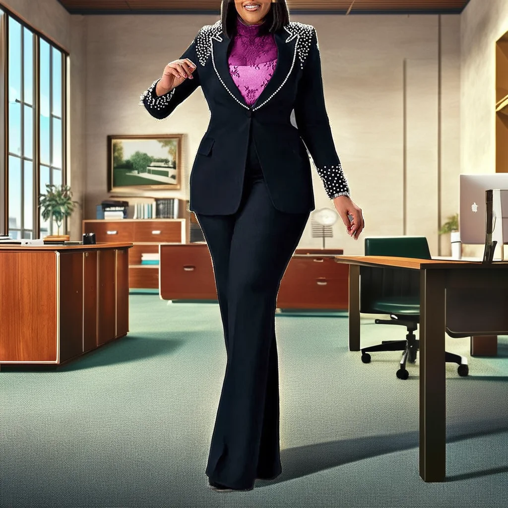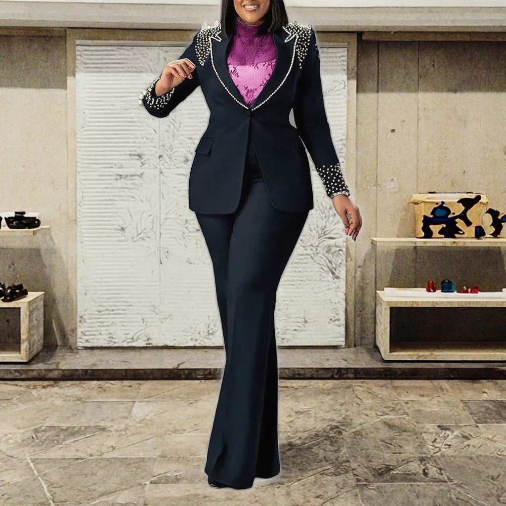 Customize Manufactory Custom Style Logo ODM Office Women's Set Pearl Short Solid Long Sleeve Elastic Slim Fit Blazer Pants Two