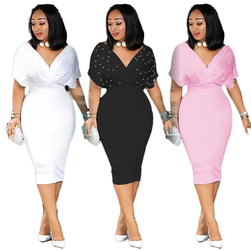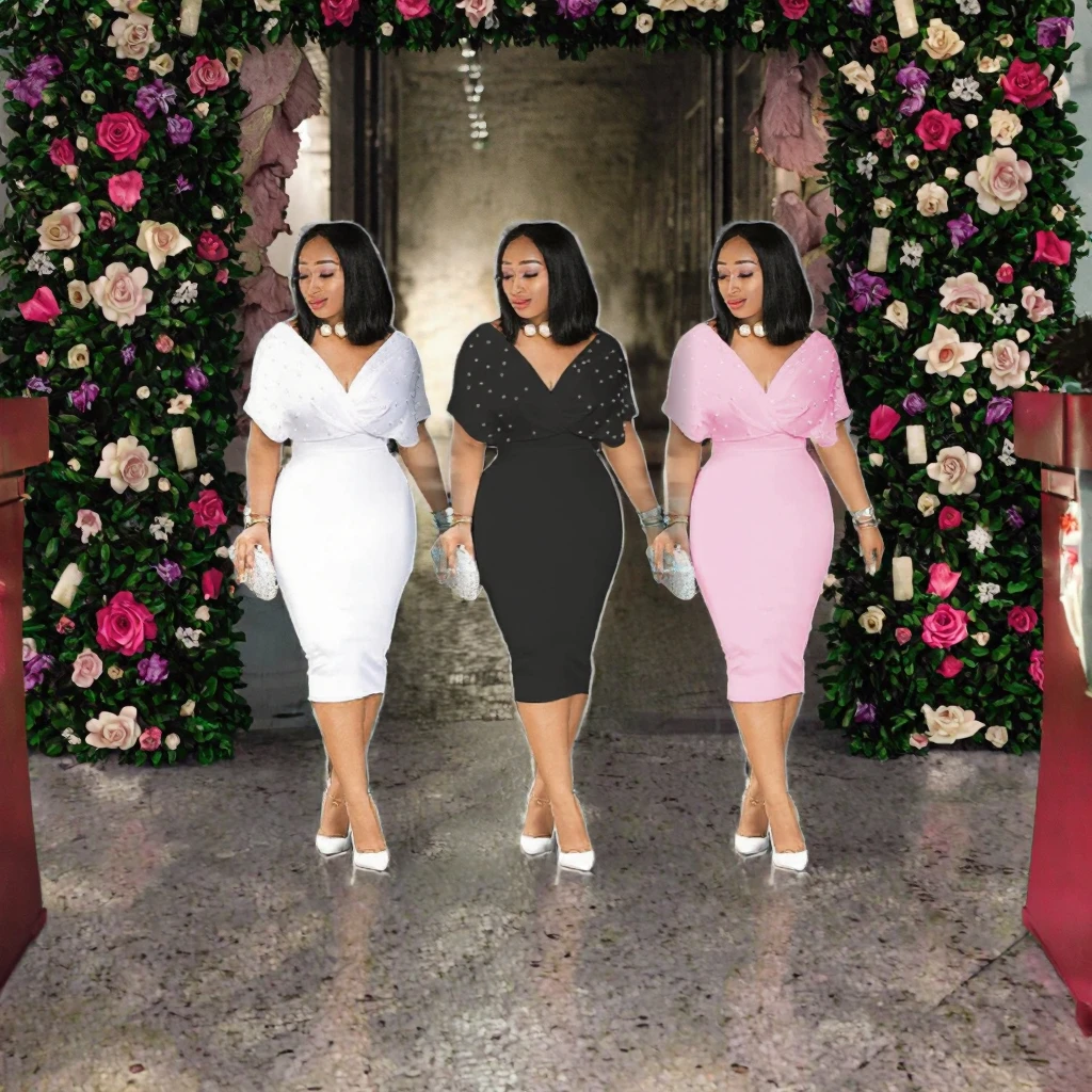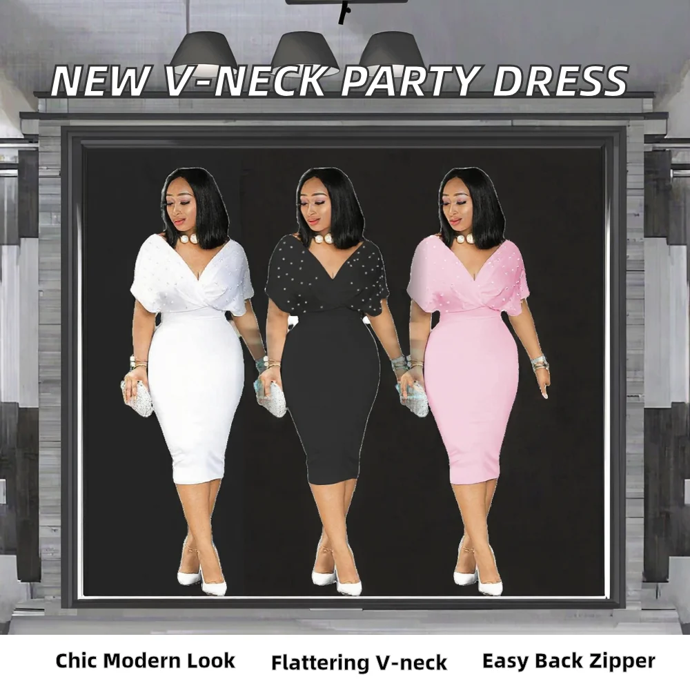 Customize New Arrivals Women's Solid Color Bandeau V-Neck Short Sleeve Summer Draped Back Zipper Bubble Casual Party Dress