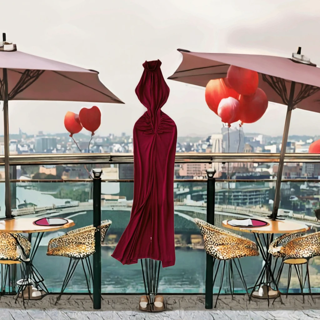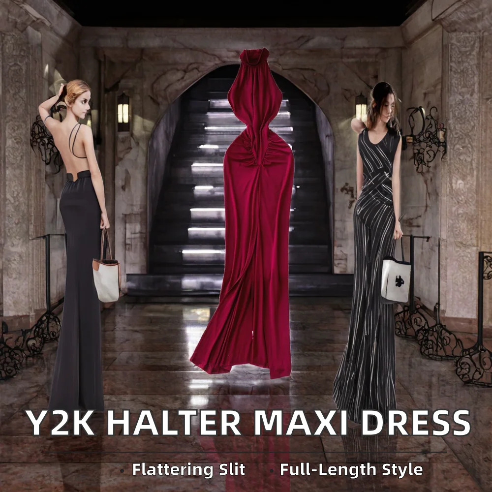 Summer Y2K Halter Slit Pleated Maxi Dress for Women Sleeveless Empire Lace Casual Breathable Sustainable Woven