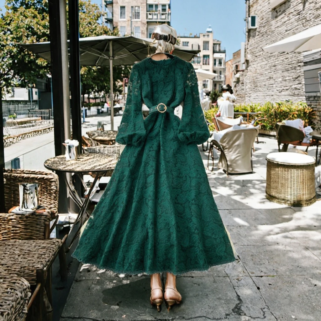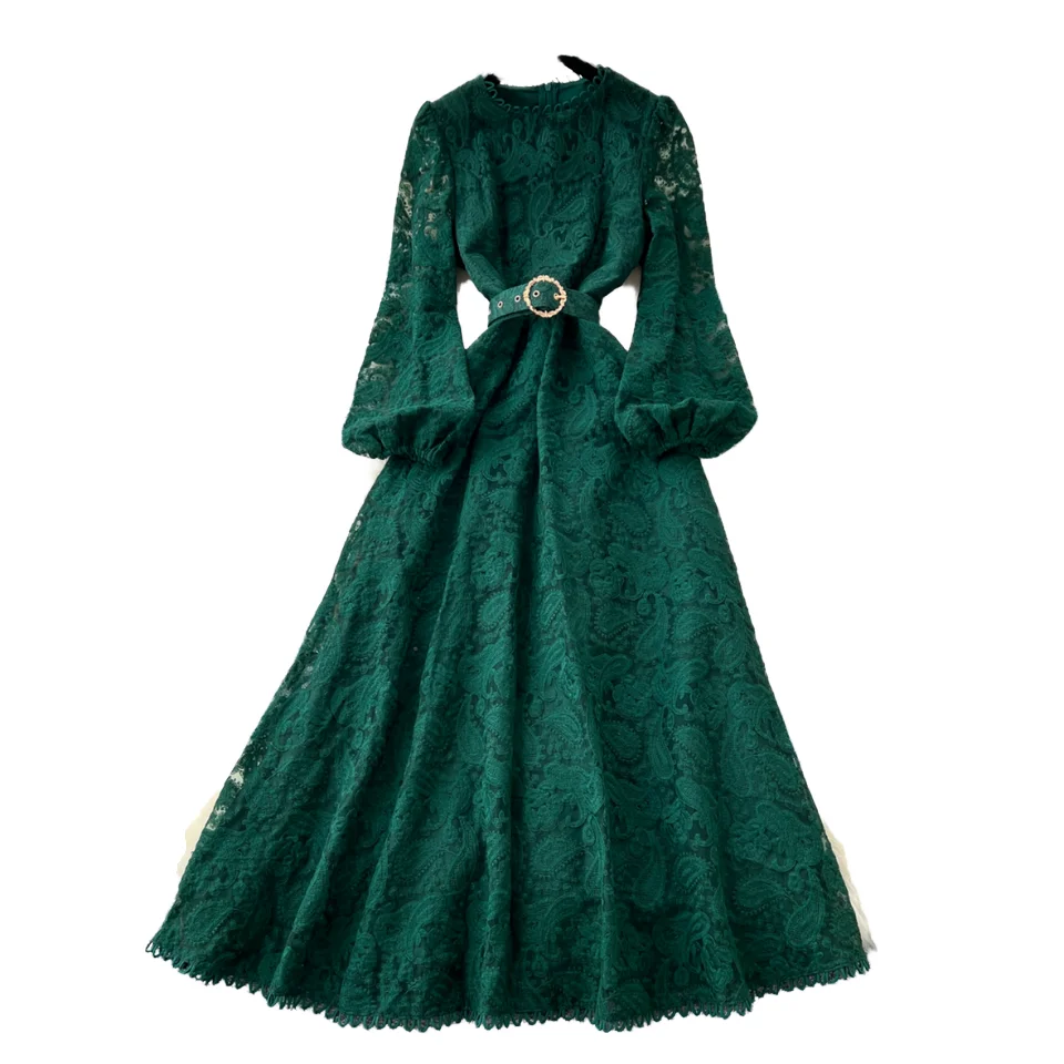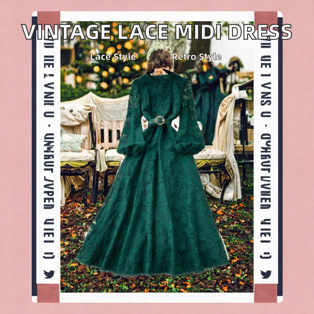 Customize Vintage Casual Sustainable Breathable Washable Woven Midi Dress for Women Puff Sleeve Empire Hollow Out Lace