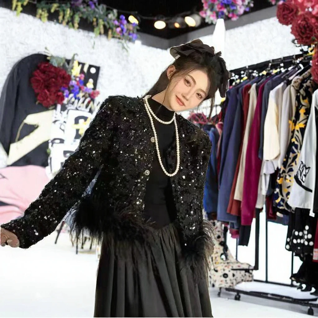 ZYHT 35239 Women's Elegant Black Velvet Blazer with White Ruffled Trim Peplum Hem & Long Puff Sleeves Chic Formal Jacket