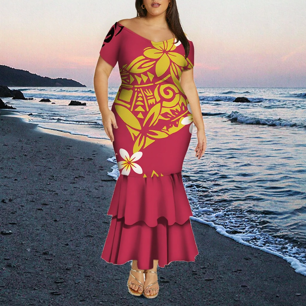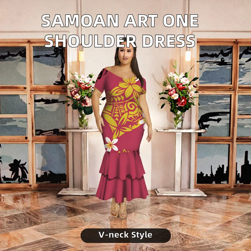 Customize Pacific Island Art Design One Shoulder Mermaid Fishtail Dress for Ladies Deep V Neck Evening Samoan Plus Size Casual