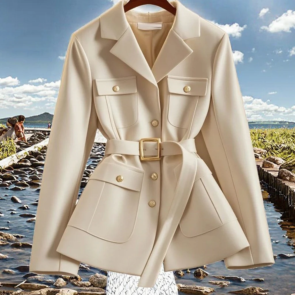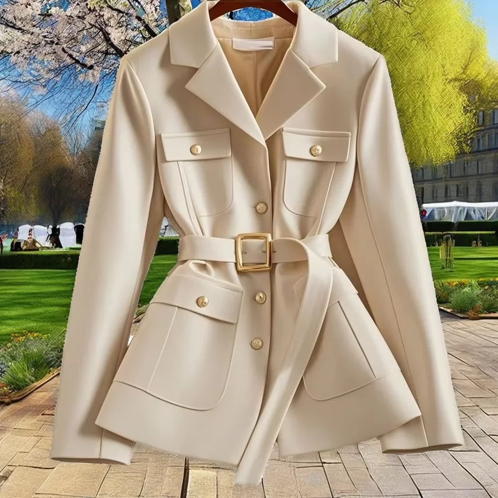 Customize New Waist-Sized Women's Casual Multi-Pocket Belted Single Button Solid Woven Top Jacket Blazer for