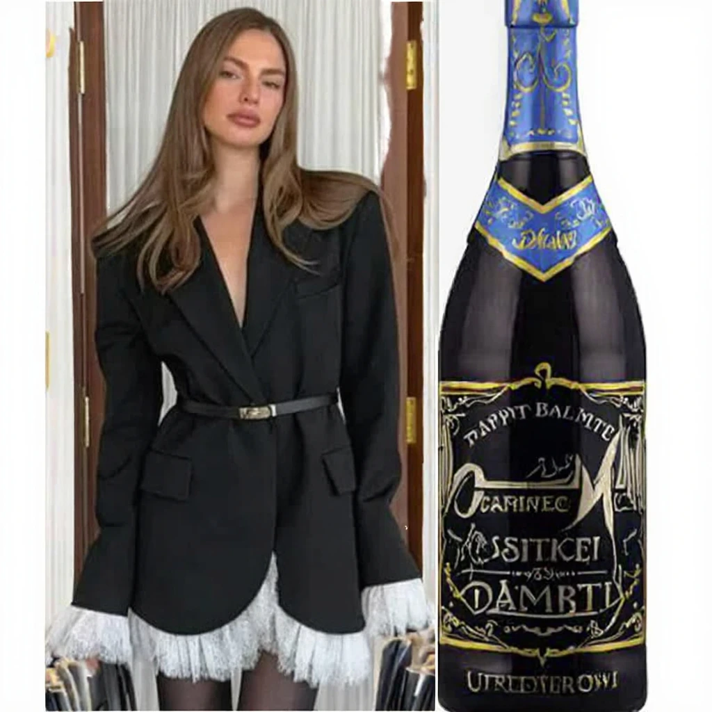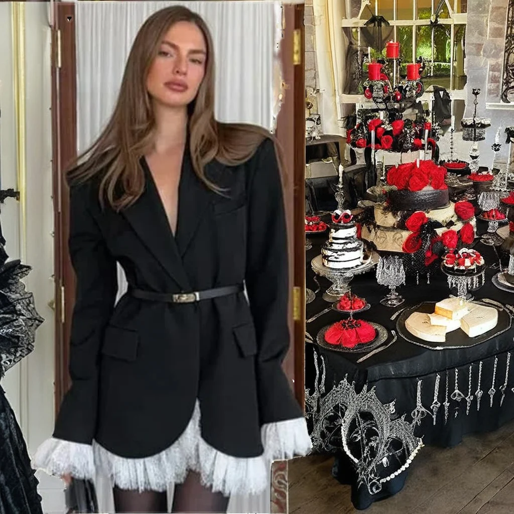 Customize Gothic Chic Solid Long Knitted Single Button Black Oversized Lace Trim Cuffs and Hem Blazer Dress for Women
