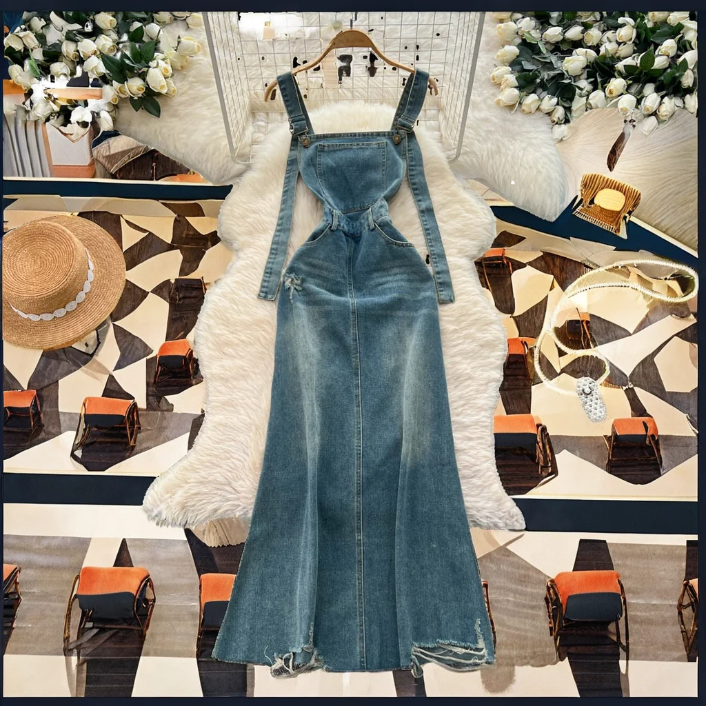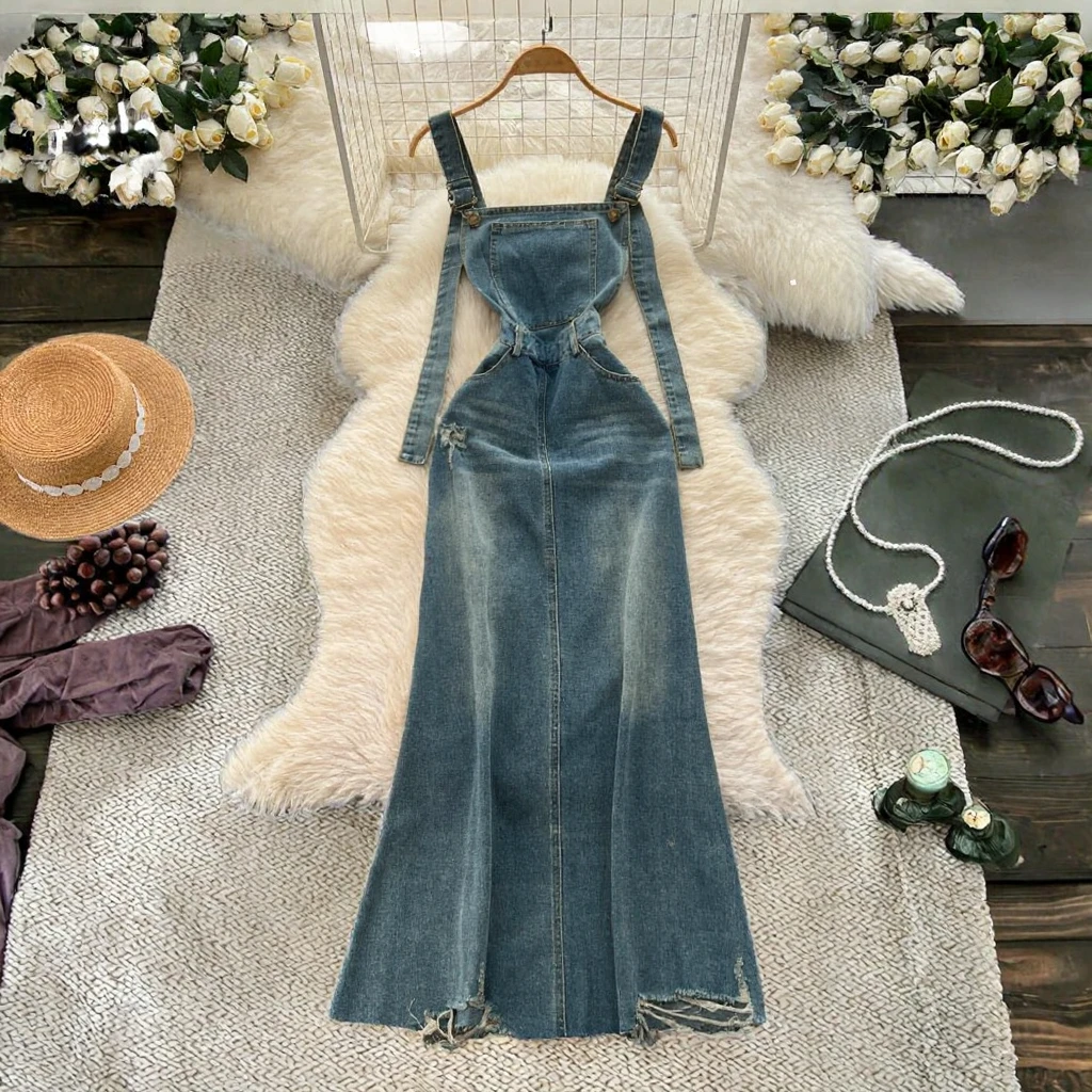 Customize Autumn Vintage Casual Maxi Dress for Women Empire Denim with Hole Detail Woven Fabric Breathable Sustainable Washable
