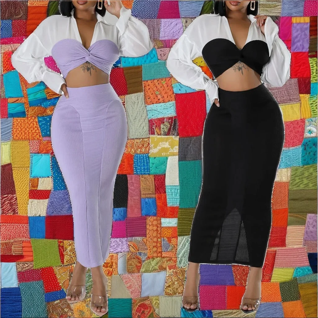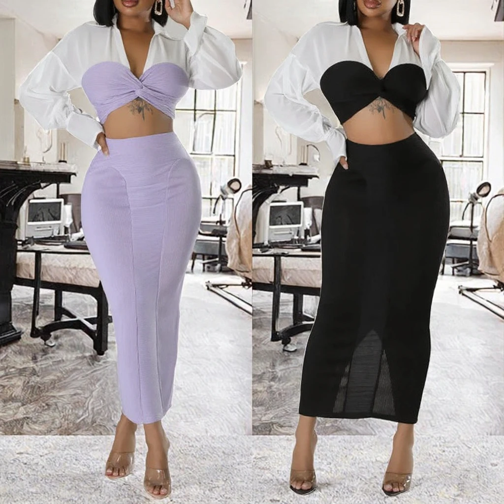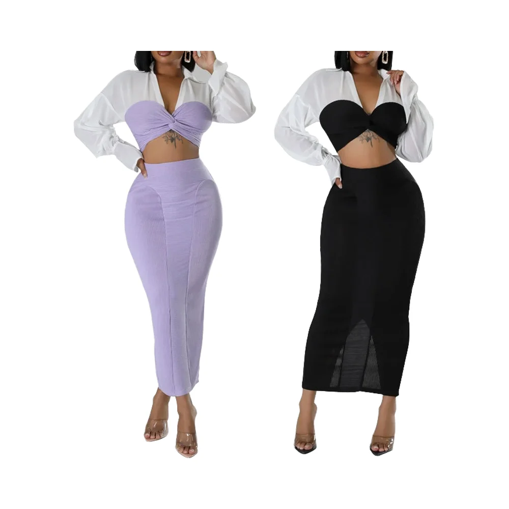 Customize Eco-friendly Skinny Fit Fashion Spring Autumn Clothing Boutique Long Sleeved Solid Short Tank Short Skirt 2 Piece