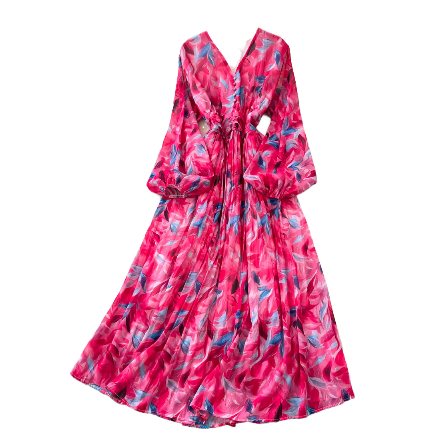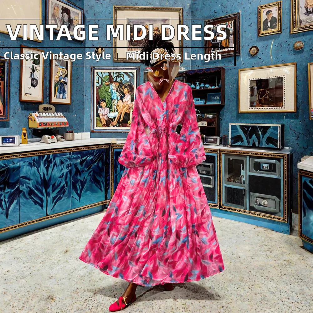 Customize Vintage V-Neck Tunic Slim Casual Midi Dress for Women Lantern Sleeve Empire Printed Lace Woven Digital Breathable