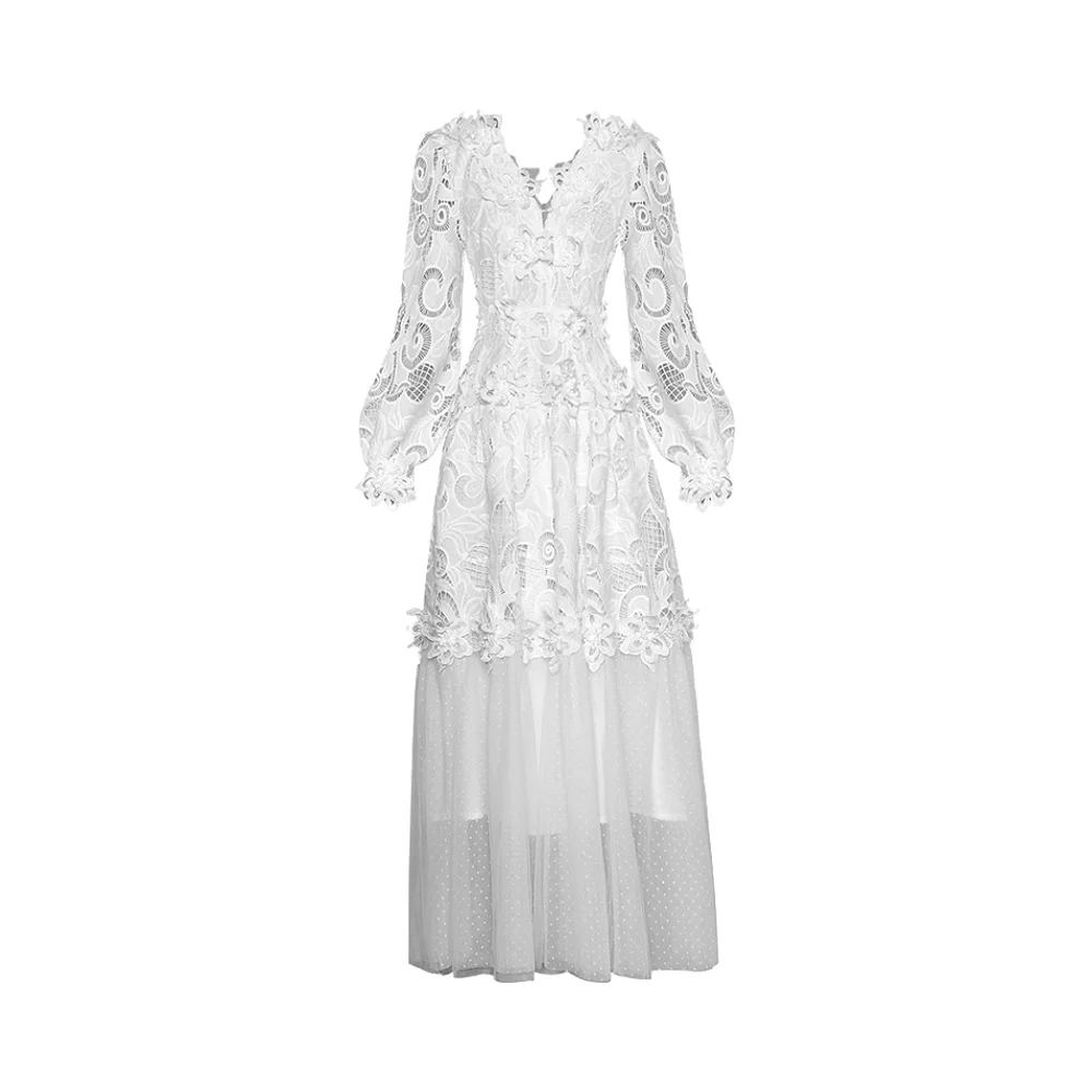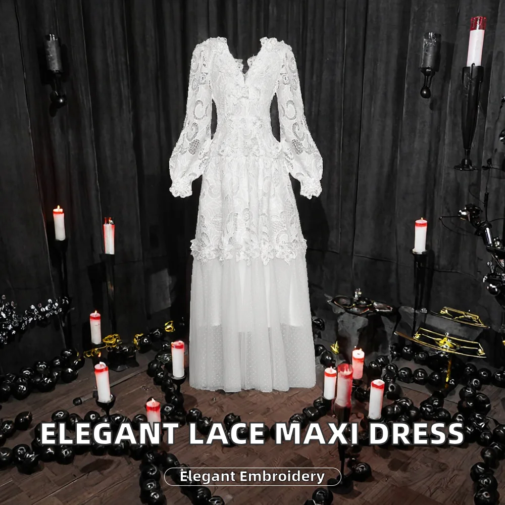 Customize Casual Women's Spring Floral Lace Zippers Embroidery Tulle Mesh Patchwork Hollow Out Vintage A-Line Floor-Length Dress