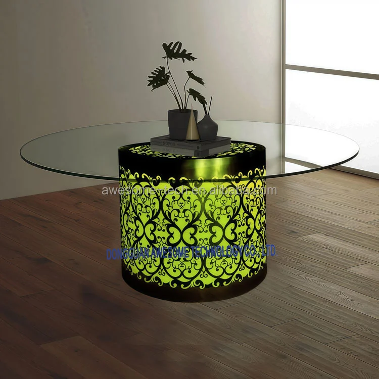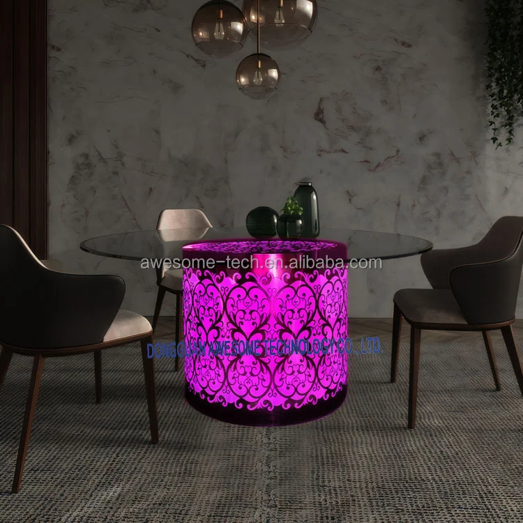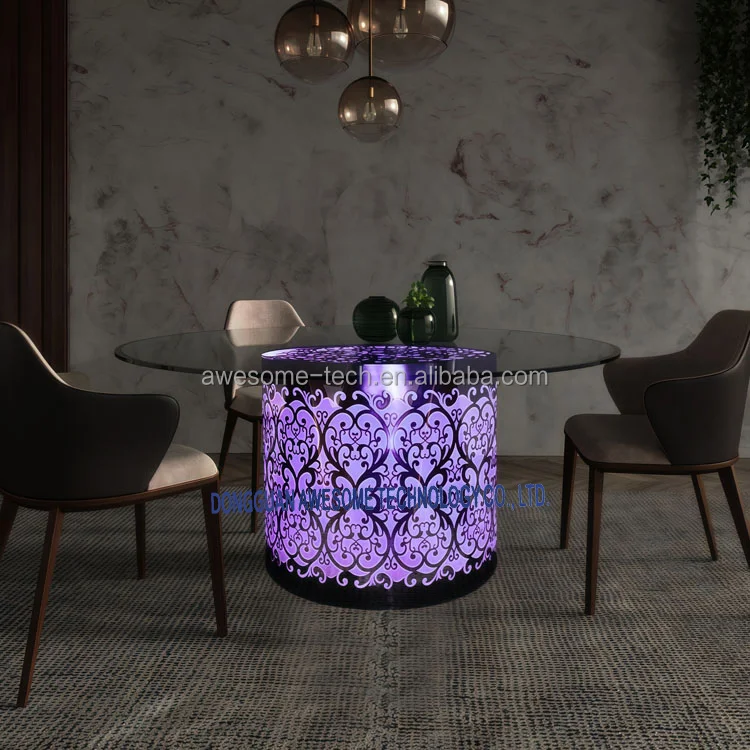 Modern Round Glass Top Dining Table LED Metal Frame and Acrylic Cylinder Base Glowing Design for Home Bar Hotel KTV