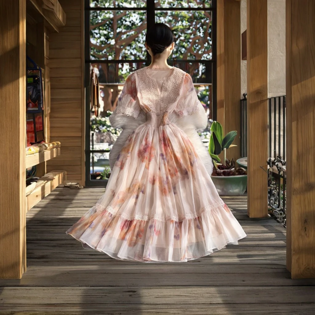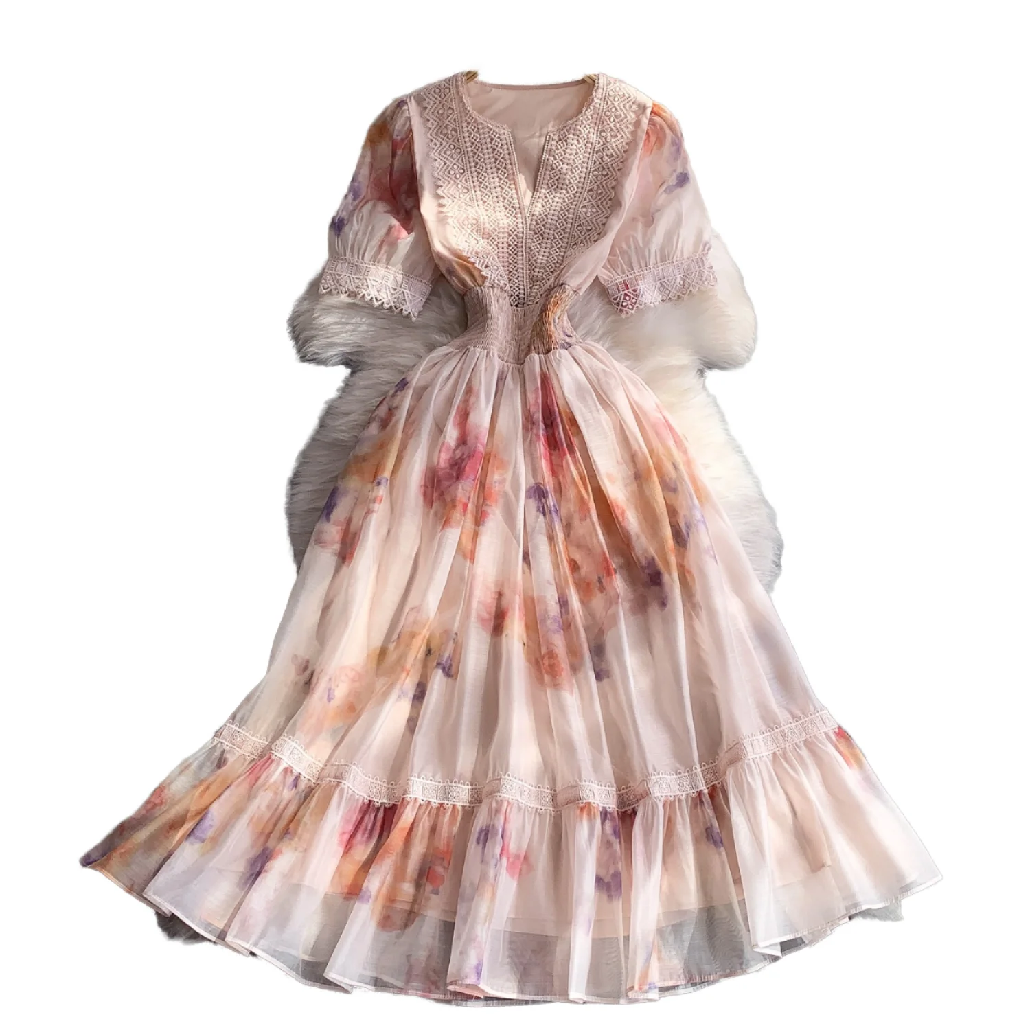 Customize Summer Holiday Style Empire Waist V-neck Lace Puffed Sleeve Casual Midi Floral Print Pink Oil Painting Dress for Women
